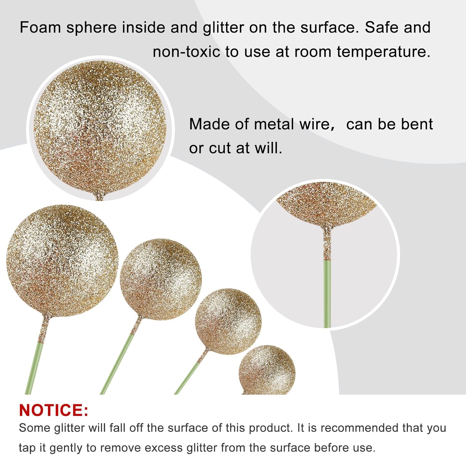 - Material: these ball decorations for cake are made of foam and wire. Safe to decorate food at room temperature, such as cake and dessert decorating use, or cupcakes, fruits, cheese and any dish and appetizer you want to decorate.