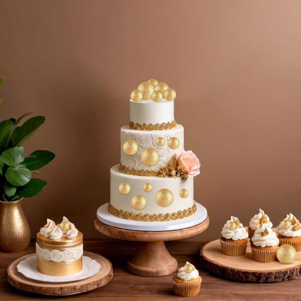 - Package includes: 20 pcs glitter gold ball cake decorations. The diameter of these ball cake toppers are 0.79 inch/ 2 cm, 0.98 inch/ 2.5 cm, 1.18 inches/ 3 cm, 1.57 inches/ 4 cm, 5 pieces of each size.