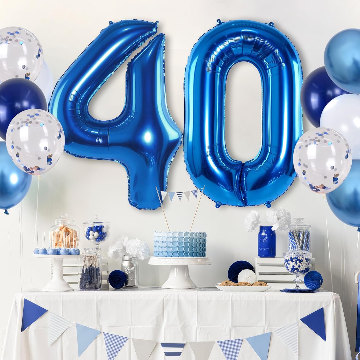 - π Dark Blue Number 40 Balloon: Our package included 40 inch foil number 40 balloon(2pcs), 12 inch metallic blue balloon(4pcs), blue silver confetti balloon(4pcs), pastel blue balloon(4pcs), Light Navy Blue Balloon(2pcs), 1pcs straw and 1 roll ribbon. Simply inflate the balloon using the straw, and you're ready to party! Navy blue number foil balloons are the best for men or women birthday party decoration.