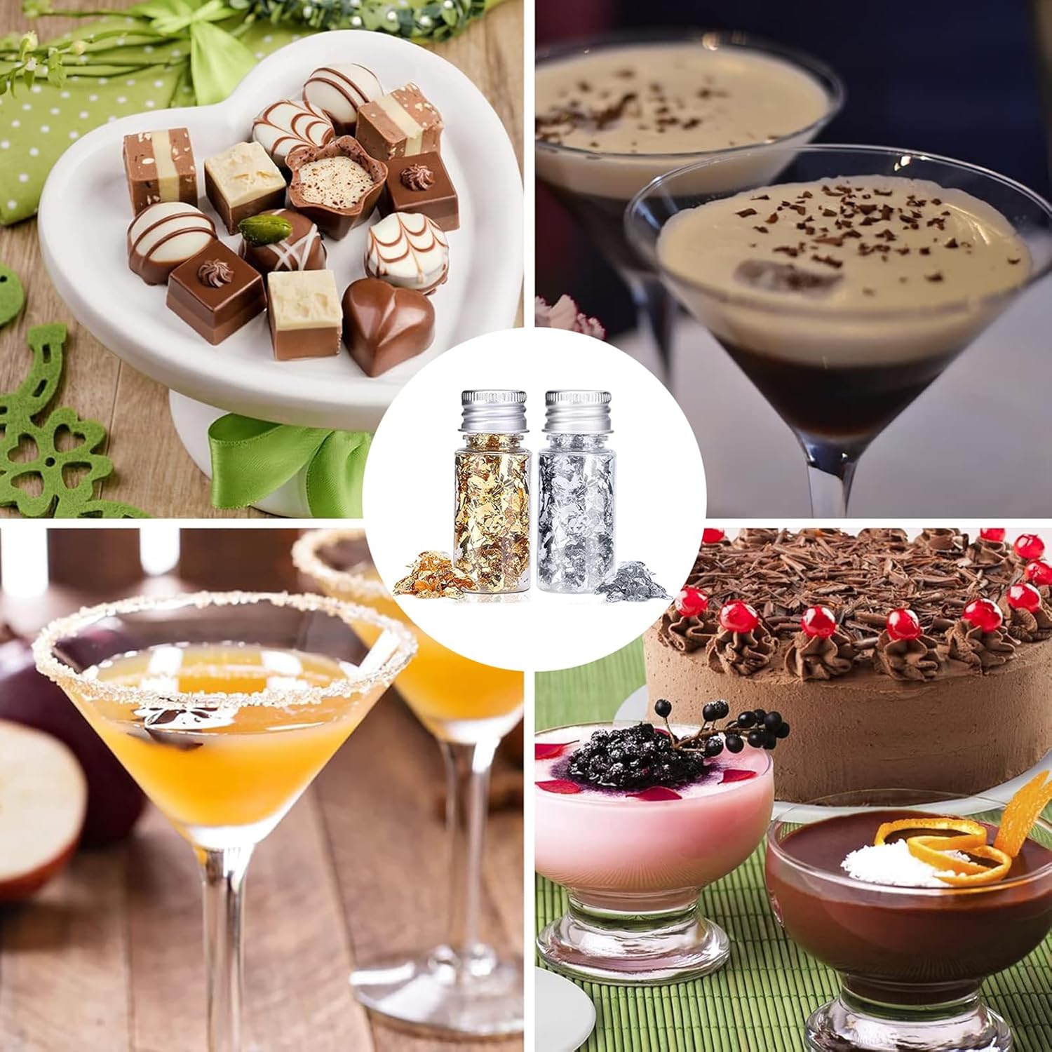 - 【Perfect Decoration For Food】Edible gold flakes is a perfect decorative items, can be added to coffee, tea, hot pot, seasonings, cosmetics, bath agents, etc. Gold leaf fakes beautiful and stylish, gold flakes for crafts can be widely used in families, bars, restaurants, etc.