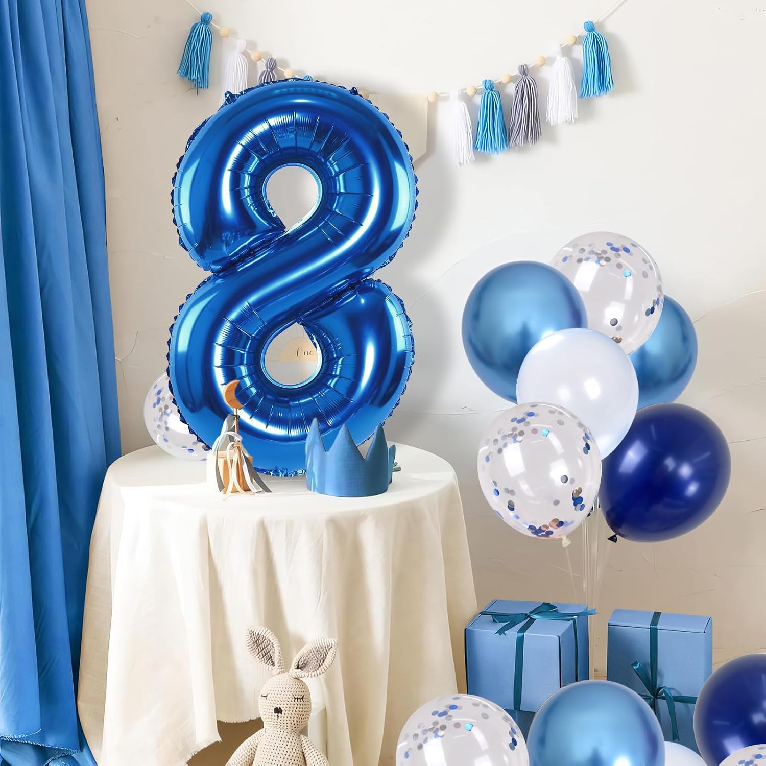 - π Dark Blue Number 8 Balloon: Our package included 40 inch foil number 8 balloon(1pcs), 12 inch metallic blue balloon(4pcs), blue silver confetti balloon(4pcs), pastel blue balloon(4pcs), Light Navy Blue Balloon(2pcs), 1pcs straw and 1 roll ribbon. Simply inflate the balloon using the straw, and you're ready to party! Navy blue number foil balloons are the best for girls or boys birthday party decoration.