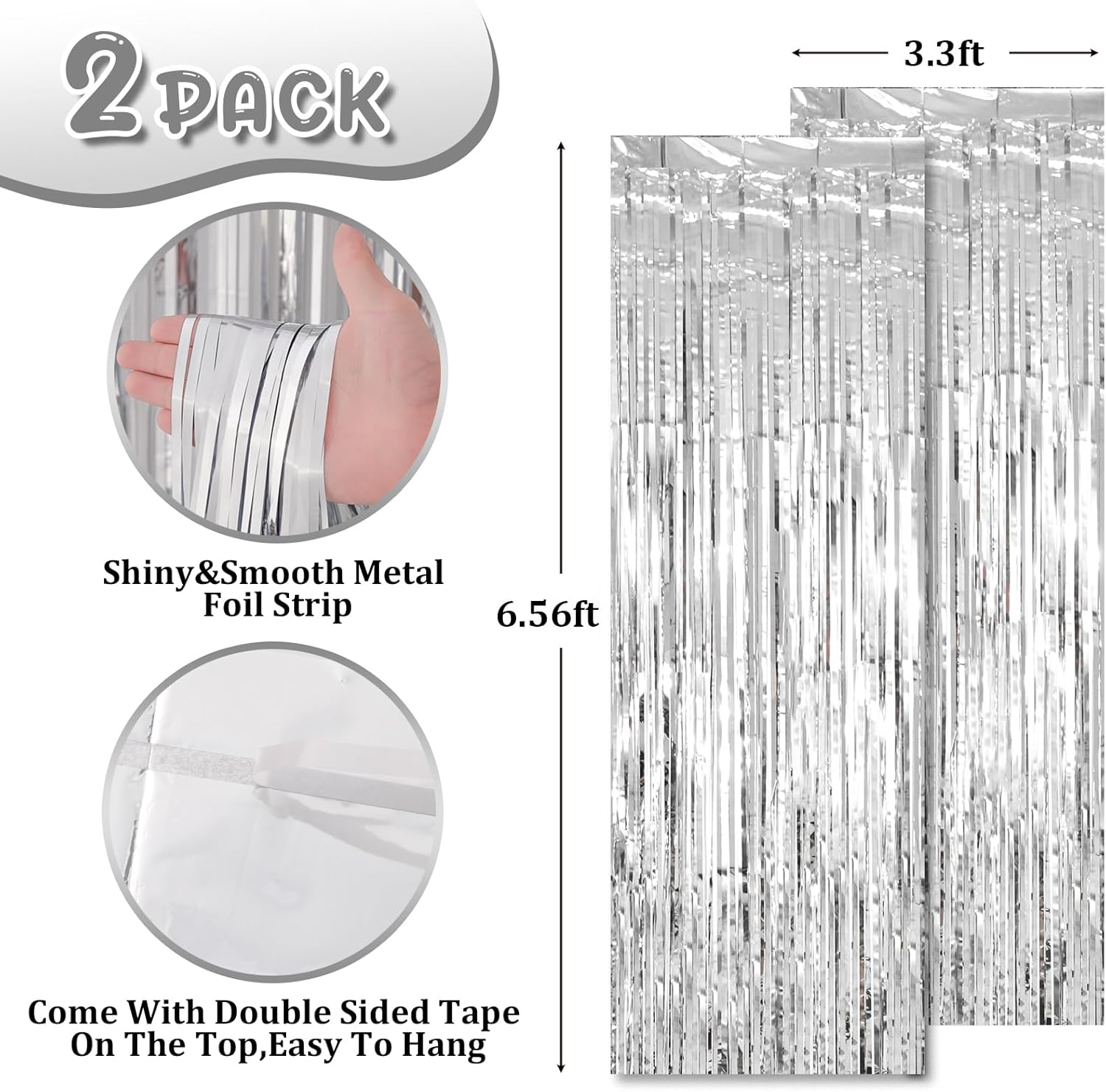 - Stunning Decorative Set: You'll receive 2 pcs laser silver foil fringe backdrop curtains, each measuring 3.28 ft (wide)×6.56 ft (drop). Enough length foil fringe curtains backdrops are perfect for the door or wall to create an impressive decoration