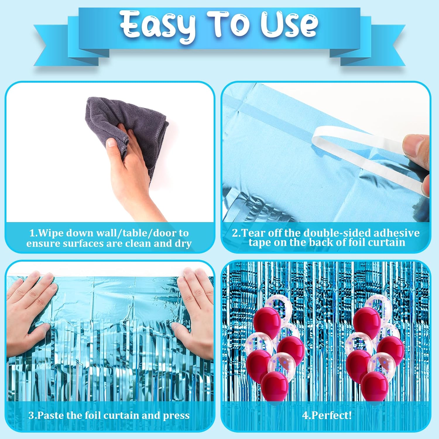 - How to Set up: Wipe down wall/table/door, ensure surfaces are clean and dry, tear off the double-sided adhesive tape, paste the foil backdrop curtains and press. Hang each individual tinsel fringe curtains in different locations for a fuller effect