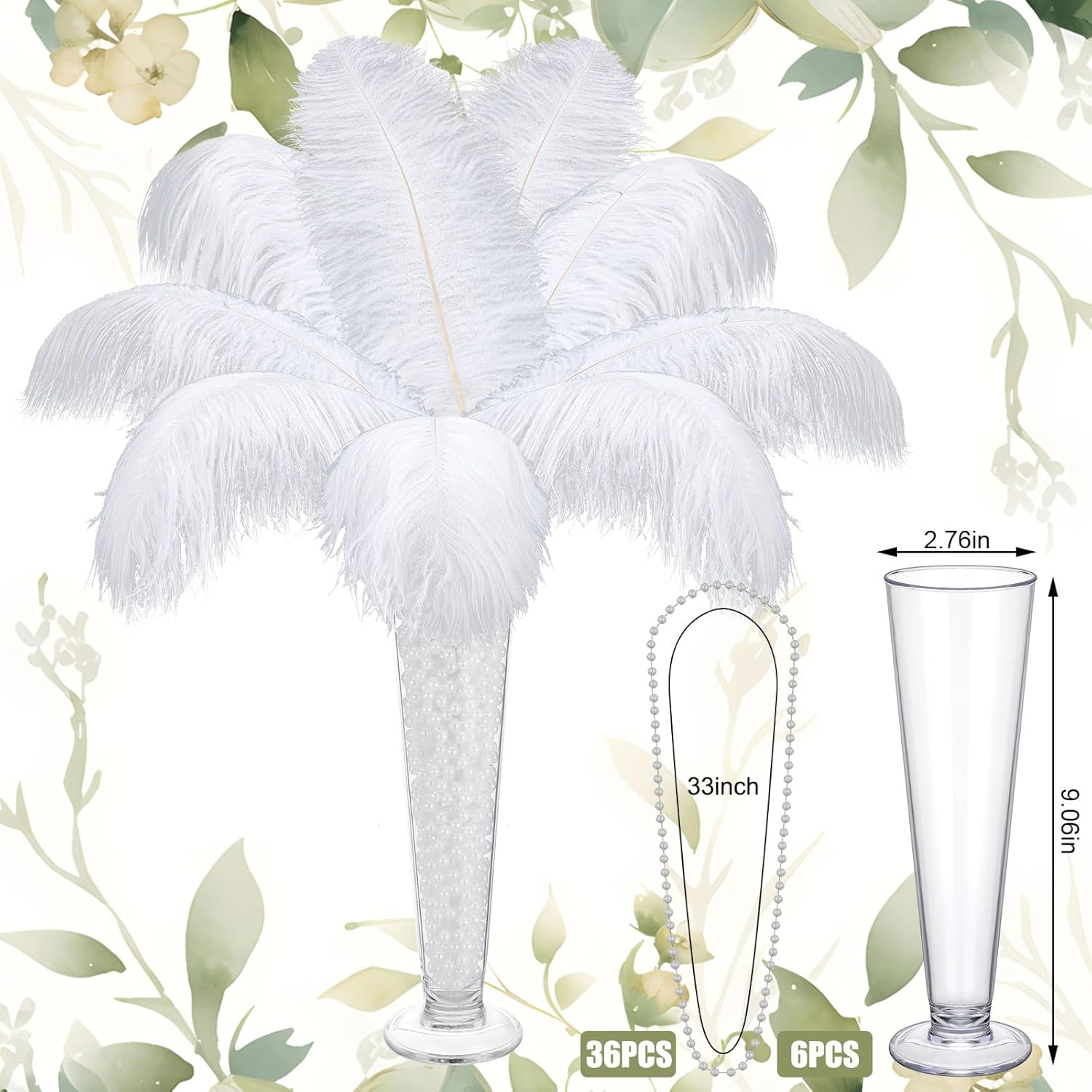 - Wedding Table Decoration Set: you will receive 54 white ostrich feathers for vases, 54 plastic hose sticks, 6 plastic vases, 9 rolls of white tape, 36 white beaded necklaces in bulk; Sufficient quantity for rich combinations, easily meet your wedding party, home decoration needs and DIY craft needs; You can also share it with your friends and family