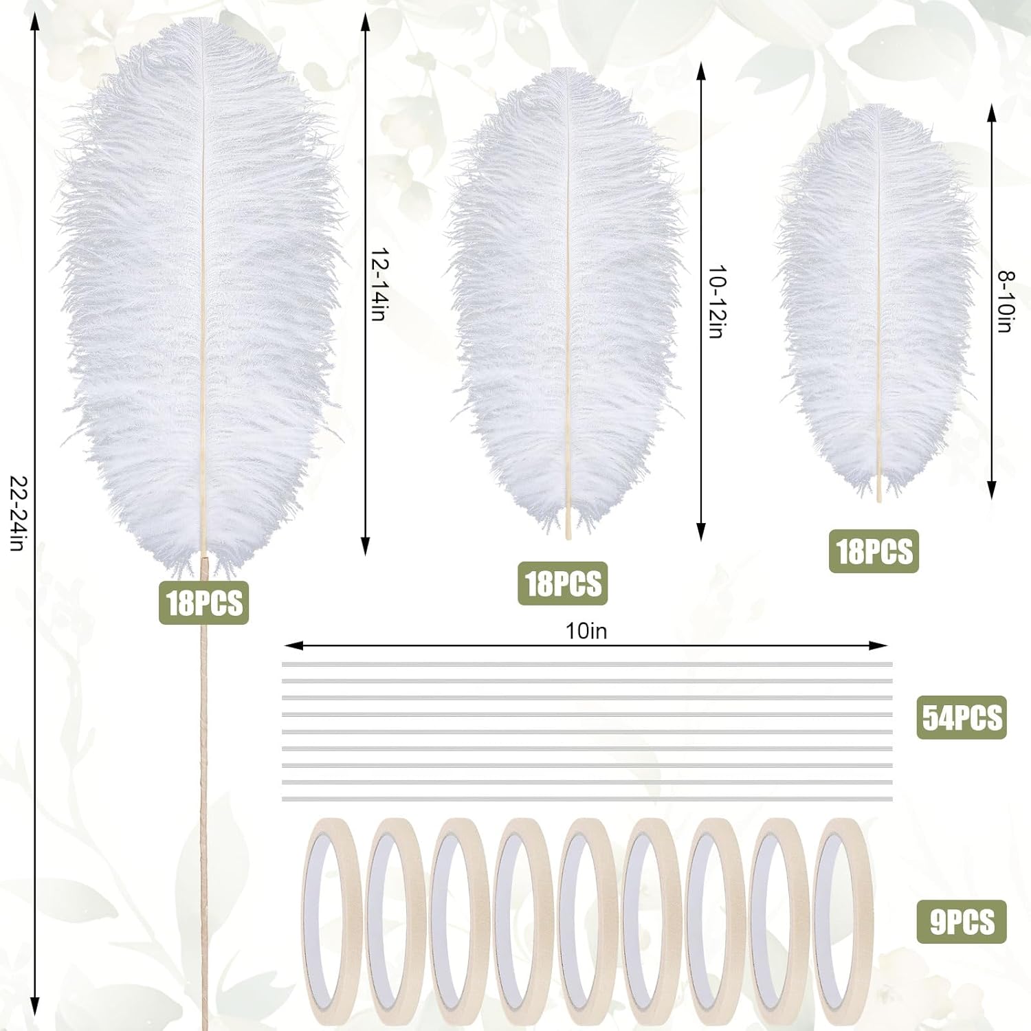 - Included Components : 54 white ostrich feathers for vases, 54 plastic hose sticks, 6 plastic vases, 9 rolls of white tape, 36 white beaded necklaces in bulk 54 white ostrich feathers for vases, 54 plastic hose sticks, 6 plastic vases, 9 rolls of white tape, 36 white beaded necklaces in bulk