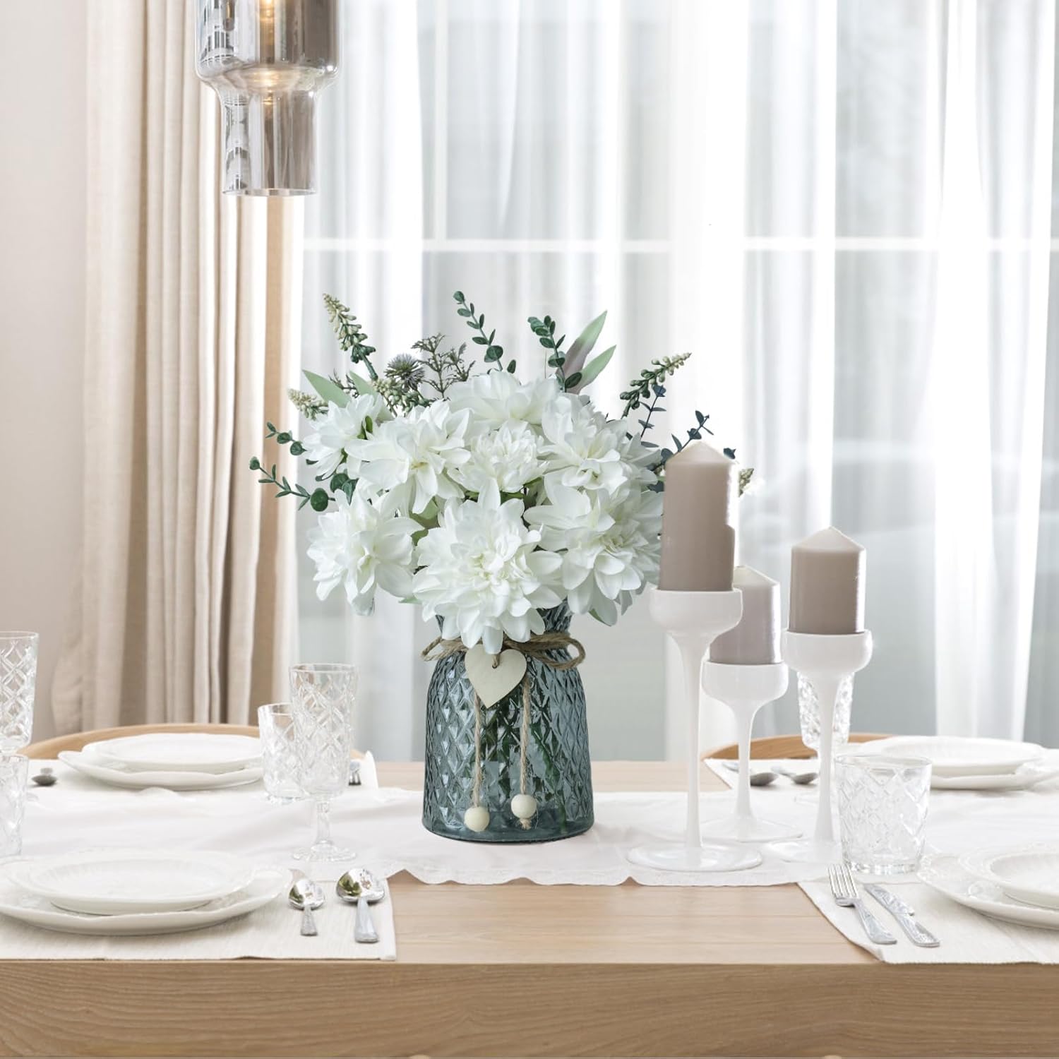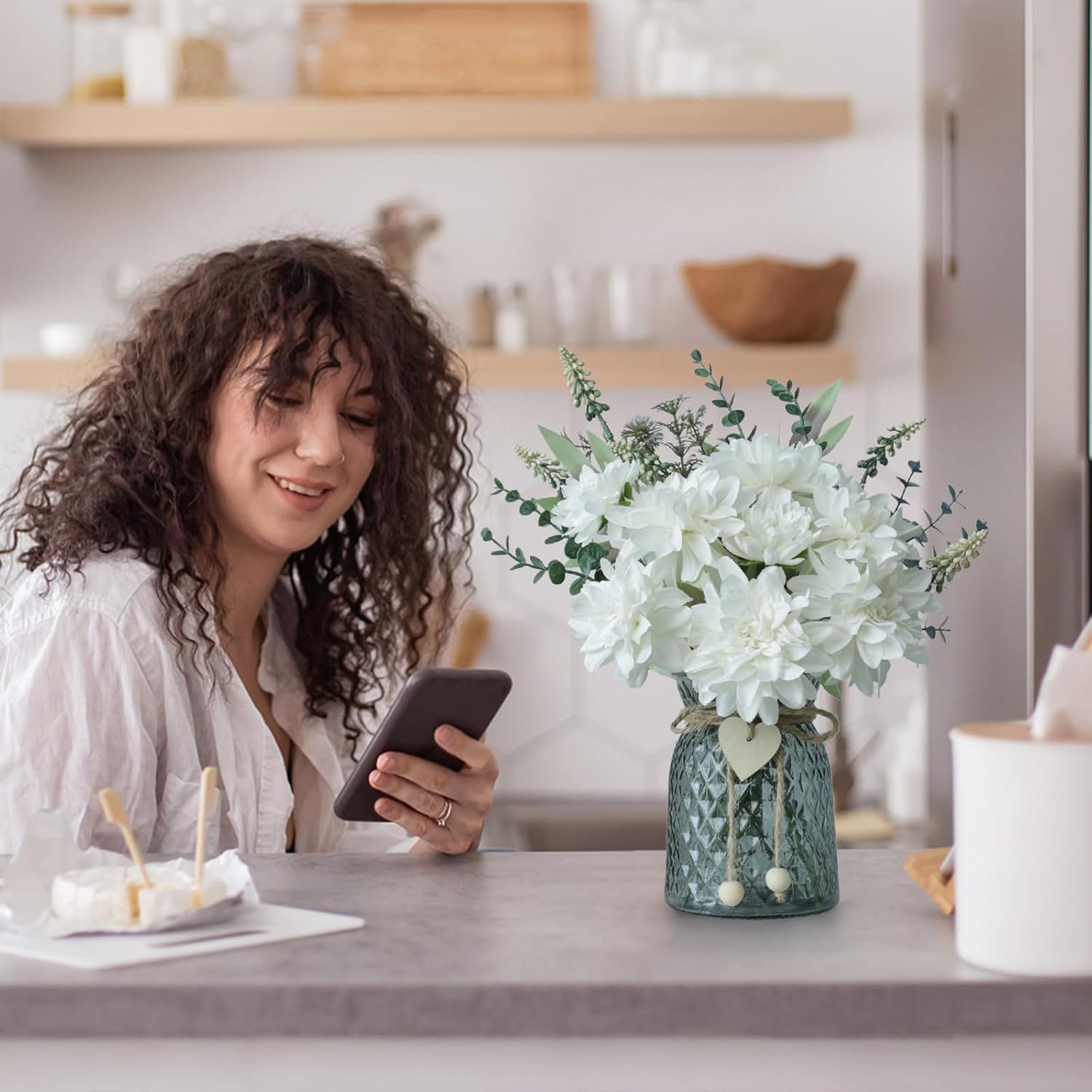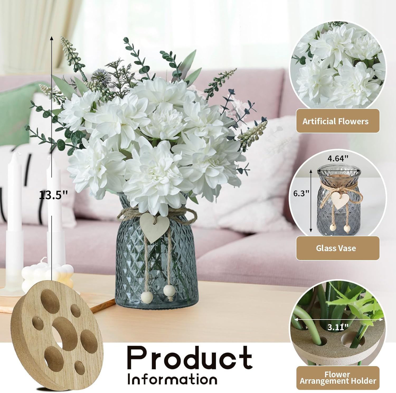 - Fake Flowers with Vase:Artificial flowers for decoration include 8 white artificial dahlia flowers,fake plants,eucalyptus stems,willow leavesa and matched flower arrangement rack and glass bottle,the mouth of the glass bottle is tied with hemp rope, and the bottle body has a wooden heart and a spherical pendant,enhance your living room,kitchen table,bathroom,fireplace,dresser,desk,coffee table decor with these realistic fake flowers in vase that bring a touch of nature indoors.