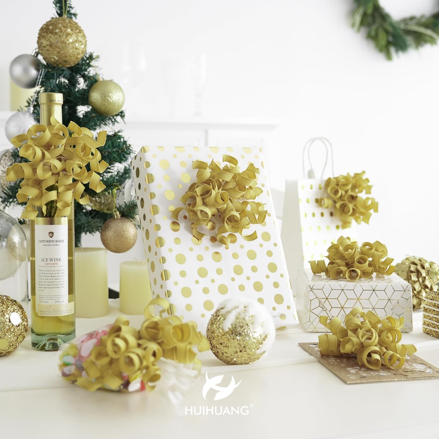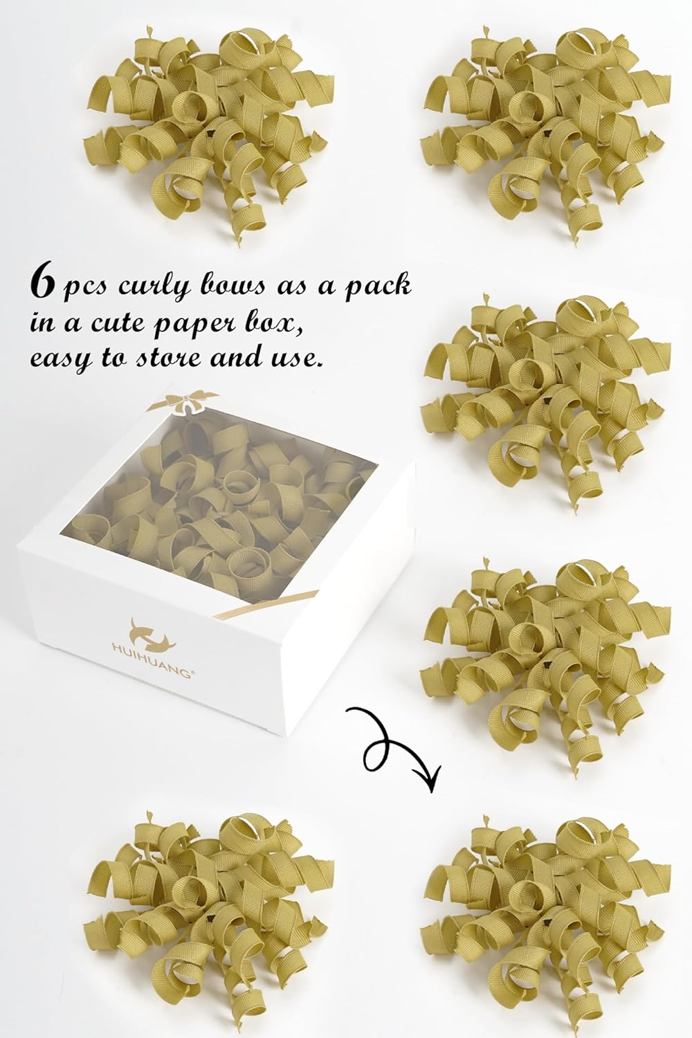 - SIZE & PACK: Each package contains 6 pcs Gold crimped curly bows are made of 12 strands of 3/8"(9mm) wide grosgrain ribbon that measure about 4.5~5" x 4.5~5"