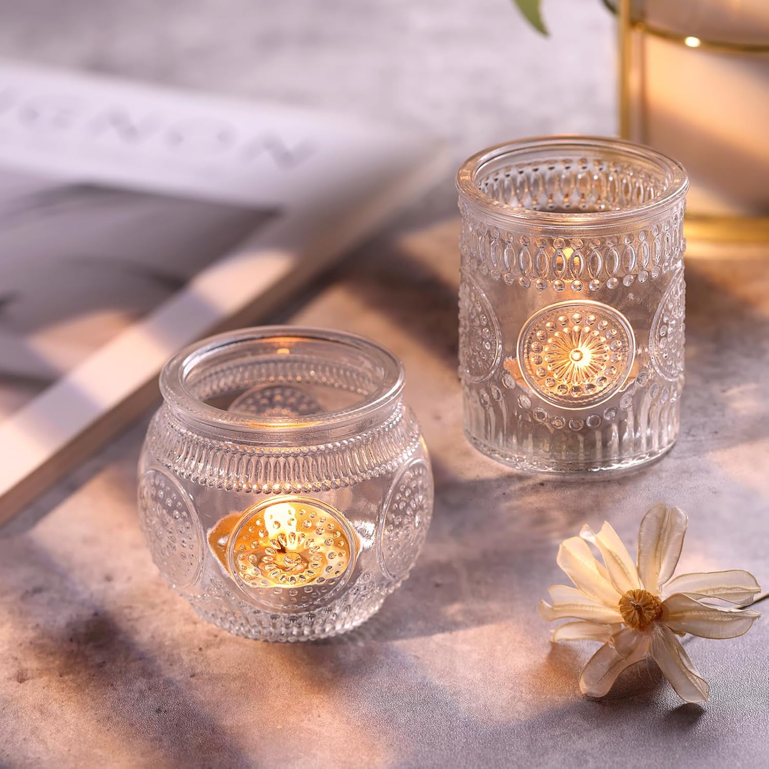 - ❤️❤️[ Vintage Sunflower Embossed Style ]❤️❤️: This is the spark collision of retro and simple fashion. The combination of embossing technology and glass makes the votives more nostalgic and textured. At the same time, we chose the sunflower element, which is very cute and exquisite on the basis of vintage. Maybe you want a special and unforgettable party, DARJEN's nice design and well-made tea lights candle holder will be a necessity for your party centerpieces.