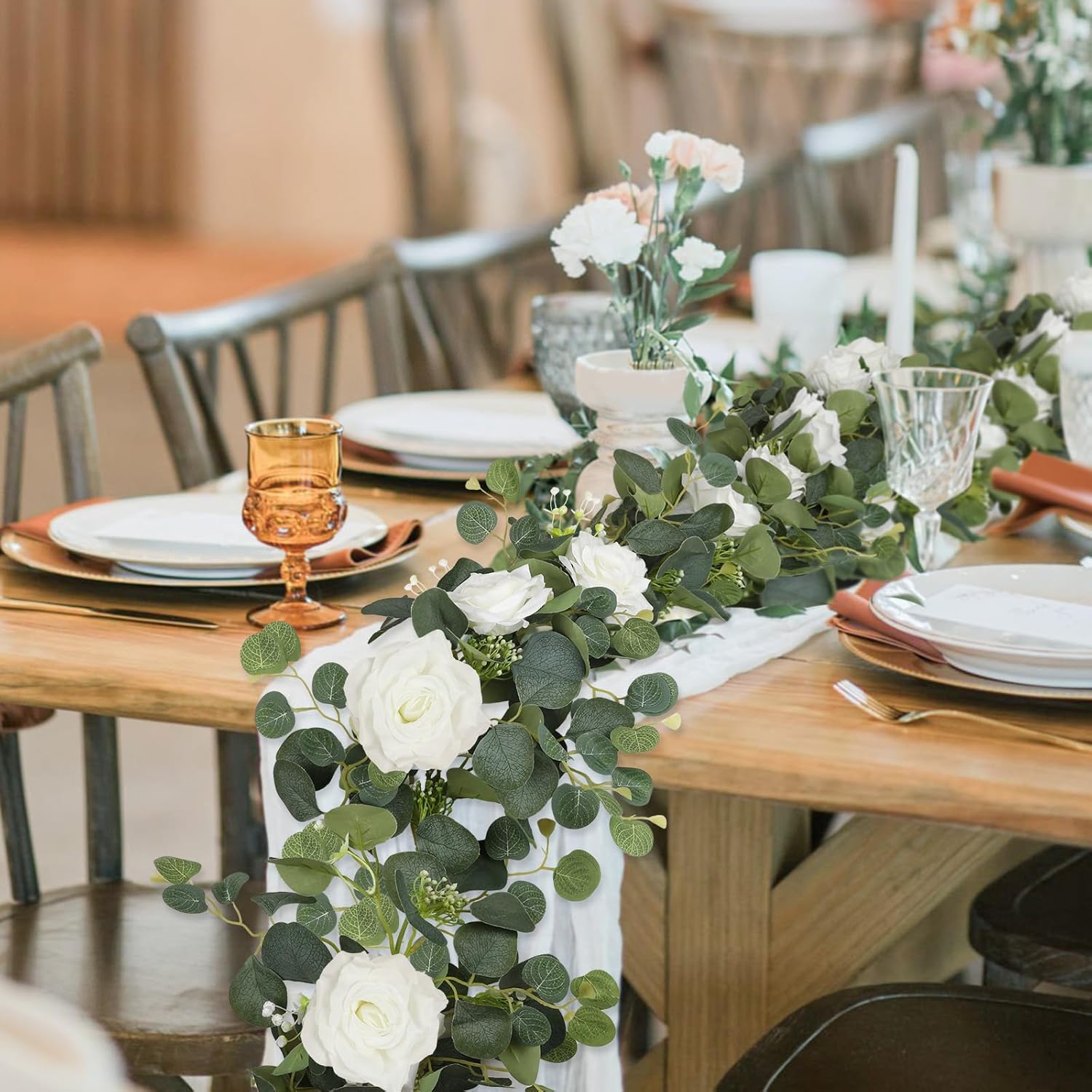 - Versatile Elegance for Every Occasion: Elevate your decor with our 6.6FT eucalyptus garland, a perfect blend of 12 white roses, abundant white gypsophila flowers, and lush artificial greenery. Ideal for wedding arch, table centerpieces, fireplace mantel, backdrops, or outdoor garden fences. Whether it’s a wedding, Mothers Day, or seasonal celebration, this garland brings timeless beauty to your space