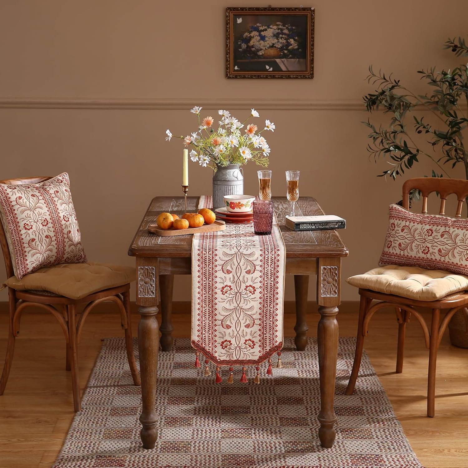 ISAENNE Designer Vintage Linen Extra Long Table Runner 118 Inches,Red Floral Pattern Modern Decor Table Runners for Dining Tables,Thanksgiving,Kitchen Tables,Christmas,Banquet,12"*118"-Chamonix A