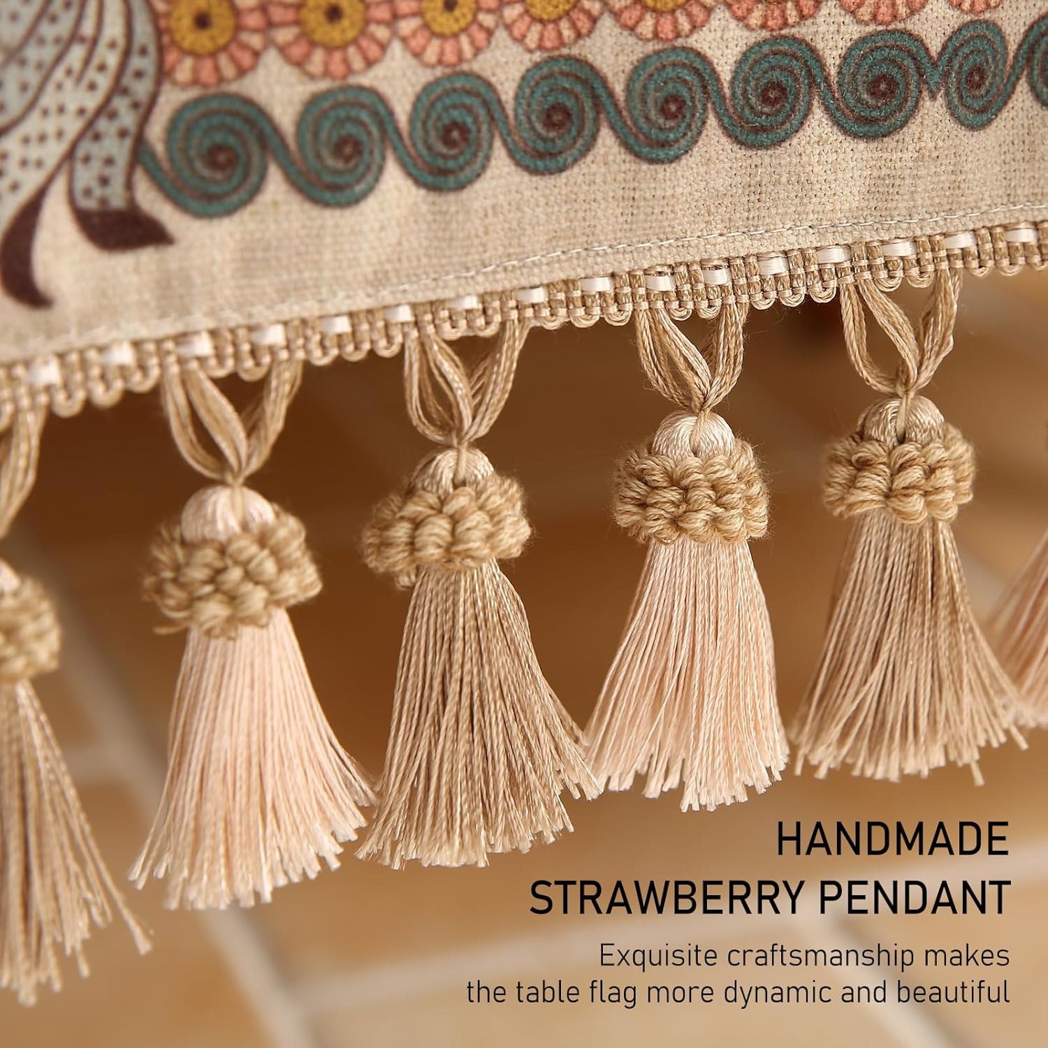 - Care Instructions:For table runners with tassels,hand washing or dry cleaning is recommended.Wash gently and air dry to maintain fabric quality.Table runners without tassels can be machine washed on a gentle cycle.After washing,they can be tumble dried on low heat; ironing is optional.Do not use bleach,as it may damage the fabric.