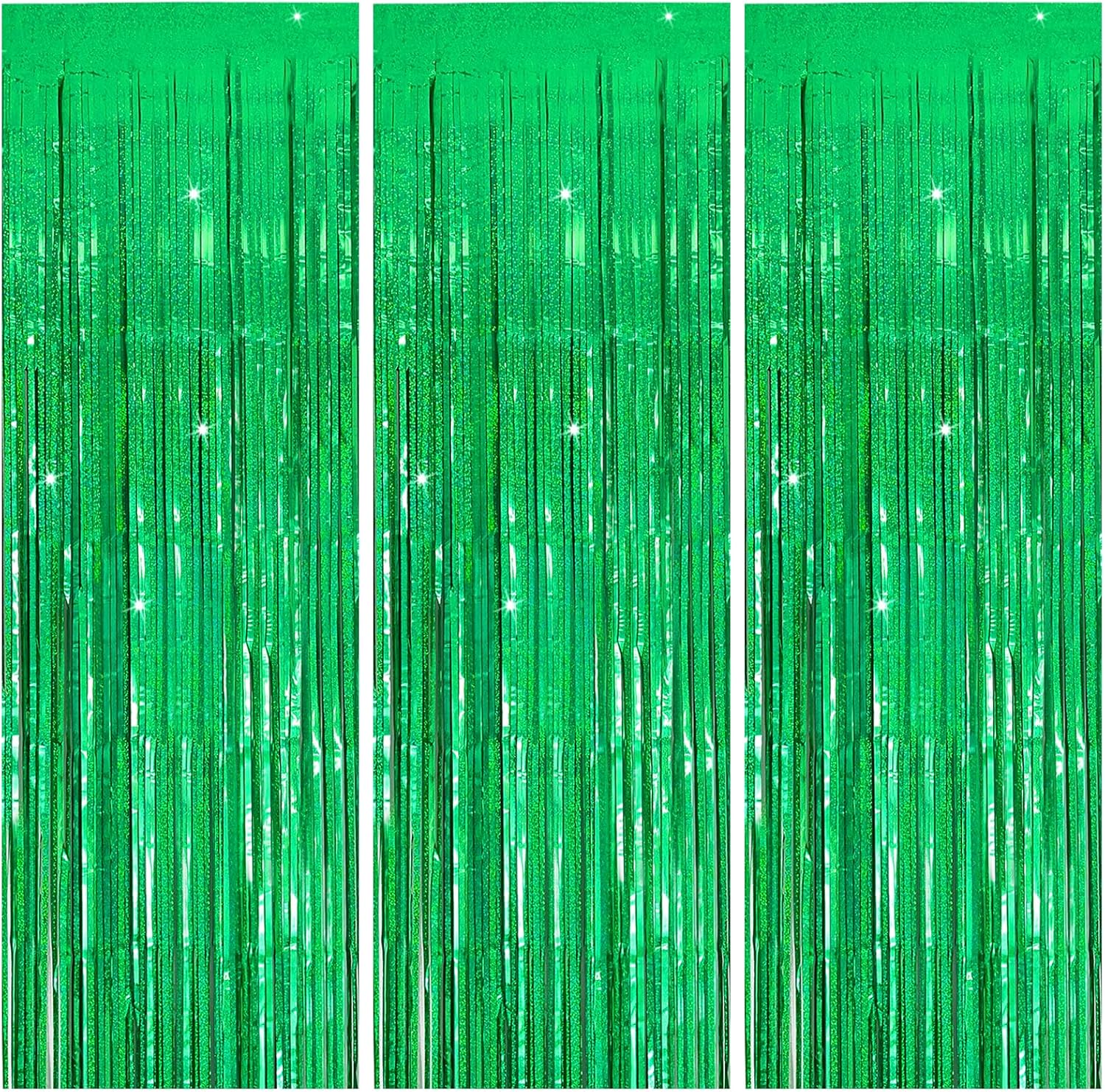 - Green Streamers:3 packs of foil fringe curtains, the size of the foil curtain is 3.28 ft x 6.56 ft.It's long enough to fit any occasion. Please do not stick the foil curtain on uneven or stained walls to prevent it from falling off.