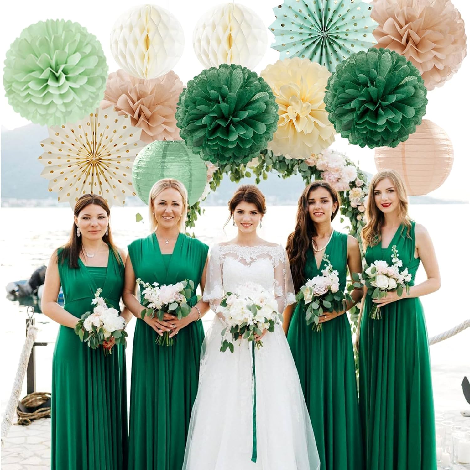 Olive-Sage Green Champagne-Gold Party-Decorations Lanterns - 14pcs Rustic Wedding Paper Fan Streamers,Tissue Pom Poms Honeycomb,Boho Bachelorette Neutral Baby Shower Birthday Bridal Decor Ouruola