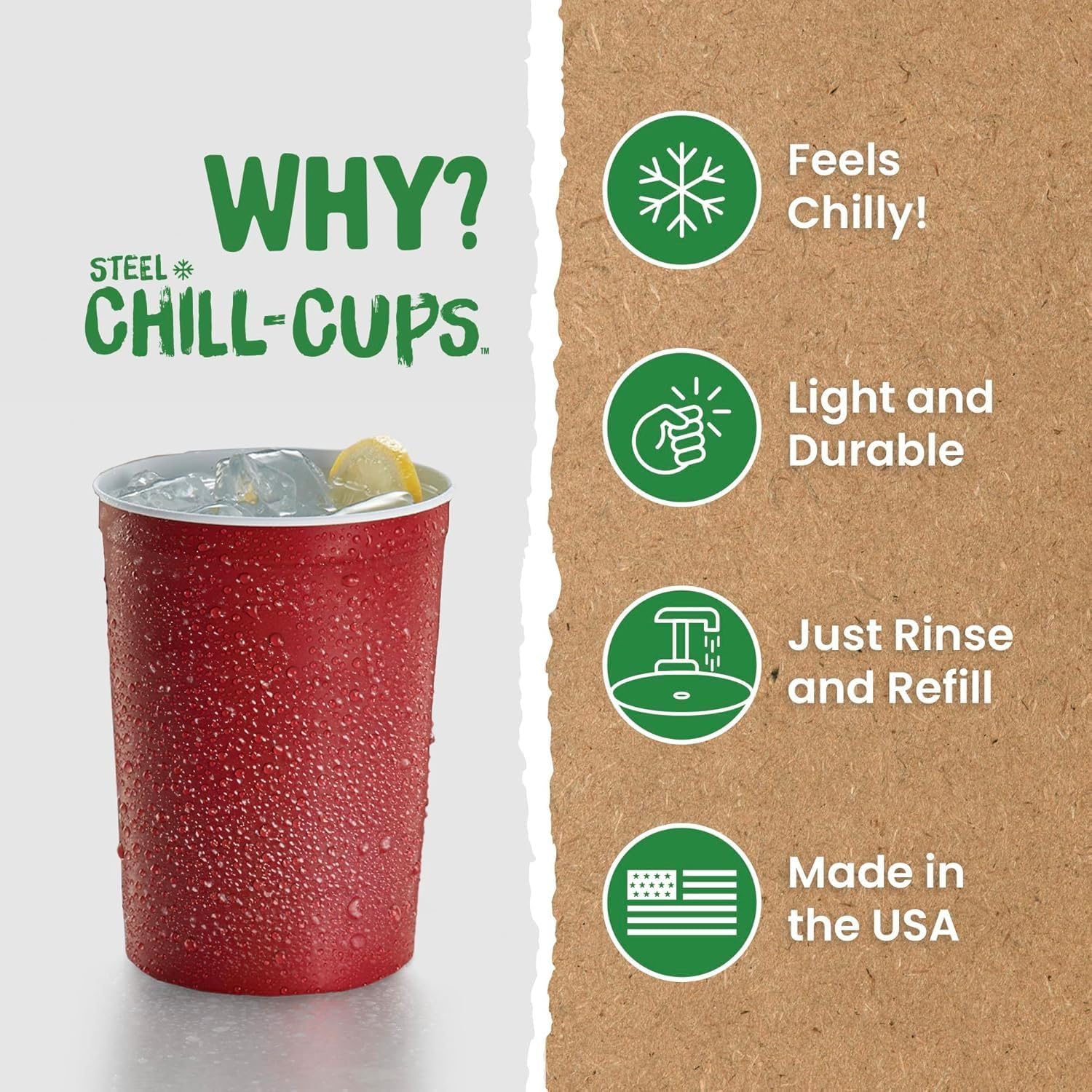 - Earth-Friendly Drinkware: Unlike plastic party cups that end up in landfills, sustainable Steel Chill Cups are 100% recyclable; reuse hand-washable cups for your corporate event