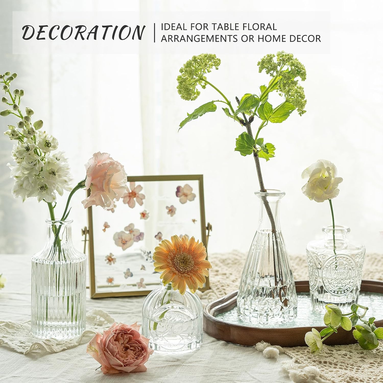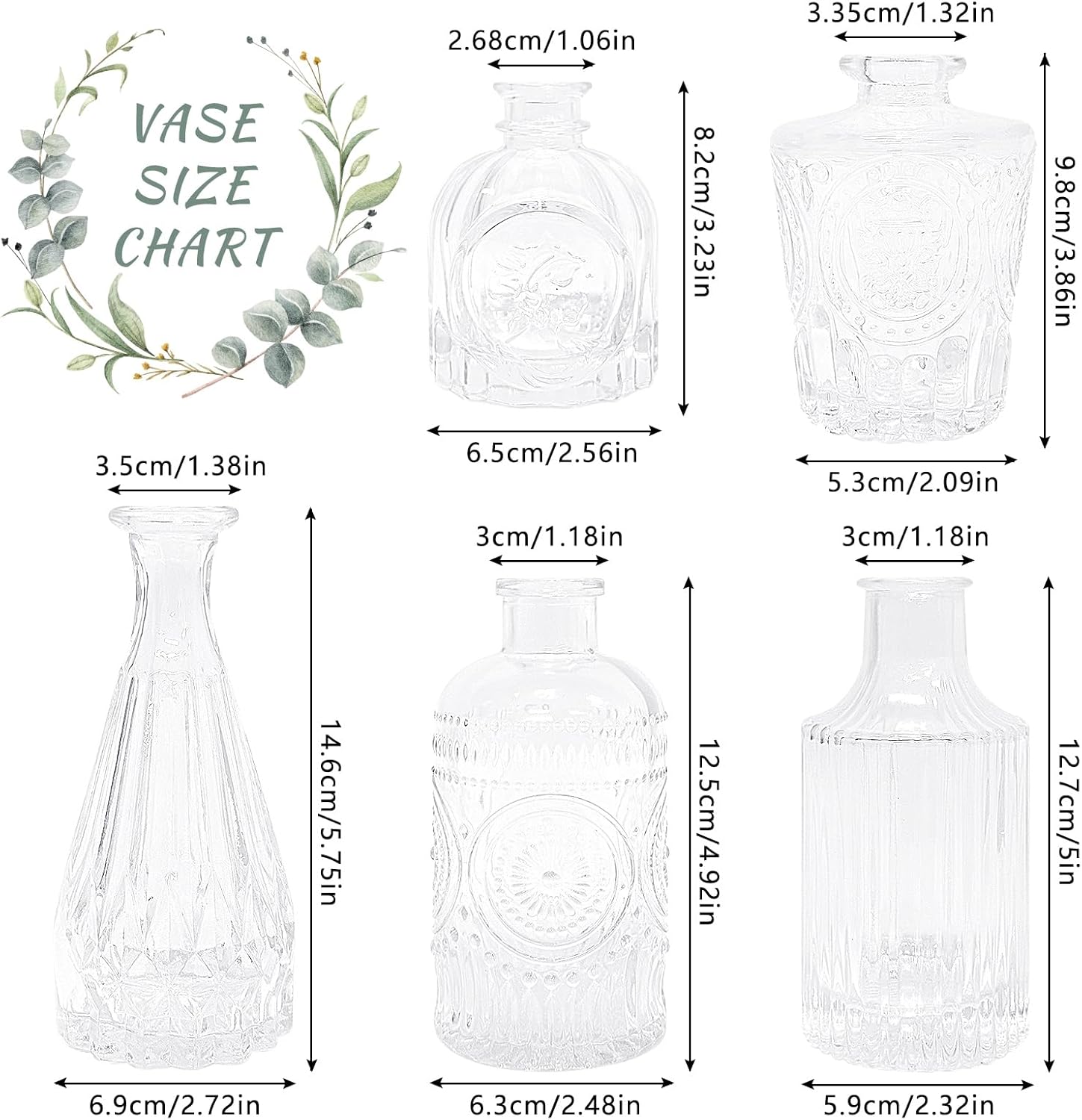 - ELEGANT VINTAGE STYLE: This set includes 5 clear glass bud vases, each adorned with delicate etched patterns for added charm. These flower vases boast a classy vintage design, suitable for any occasion, from casual to formal. Spruce up your window sill, dining table, or wedding reception with these beautiful vintage décor vases, creating an elegant centerpiece that will captivate all who see them.