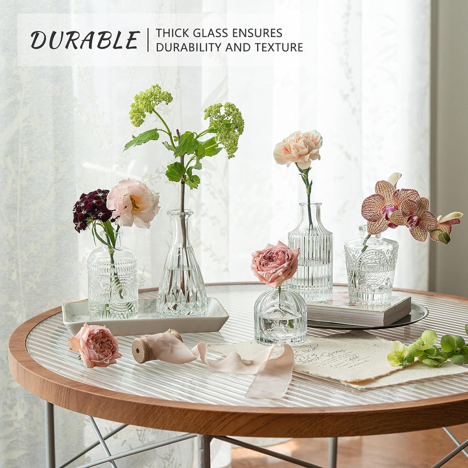 - DURABLE & SOLID GLASS: These charming small flower vases are crafted from thick, durable glass that is resistant to breakage. The surface is adorned with intricate patterns, creating a lovely texture that shimmers beautifully in the light. These vases allow you to admire the natural beauty of each flower and garden cutting, adding a touch of elegance and beauty to your home.