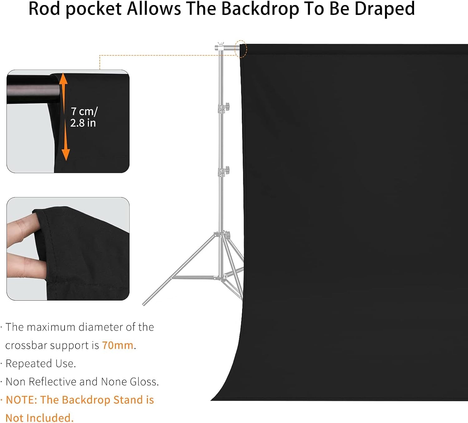 - 【ROD POCKET & TUCKED EDGE】This black photography backdrop features a 7 cm rod pocket at the top, compatible with most backdrop stands (stand not included). The crossbar easily slides through the pocket, ensuring secure hanging, wrinkle-free stability, and effortless rolling/unrolling—improving work efficiency. The fabric drapes seamlessly for a smooth background, and all edges are reinforced to prevent fraying