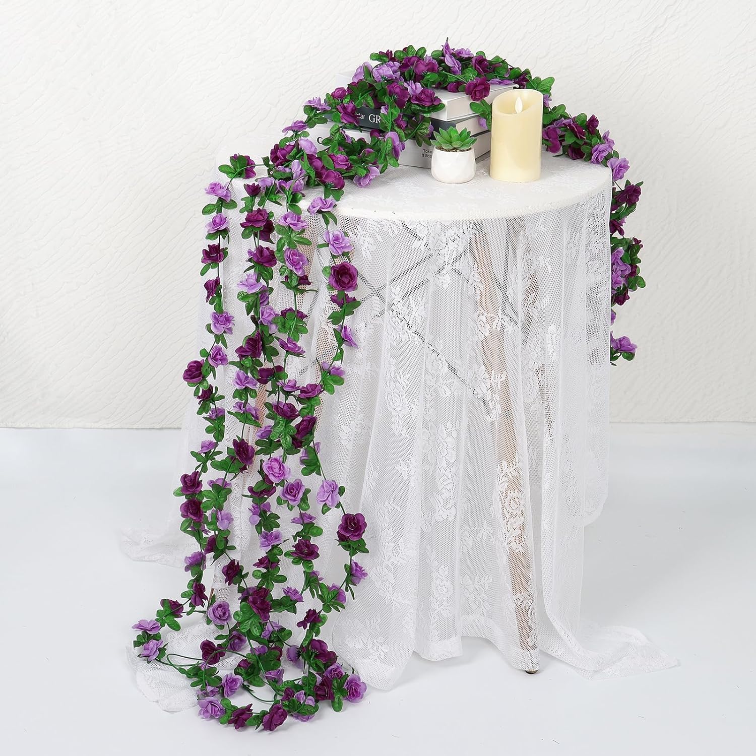 - 【Abundant Application】Purple rose garland decorations can create a romantic and fairytale atmosphere for your life. Suitable for many scenes such as wedding arch, birthday party, anniversary, Valentine's Day. It can be used to decorate dinner-table, gardens, fencing, sheds, swing frame, rattan chair, air-conditioning pipes, exposed wires, stairs, shop, restaurant, office, etc.