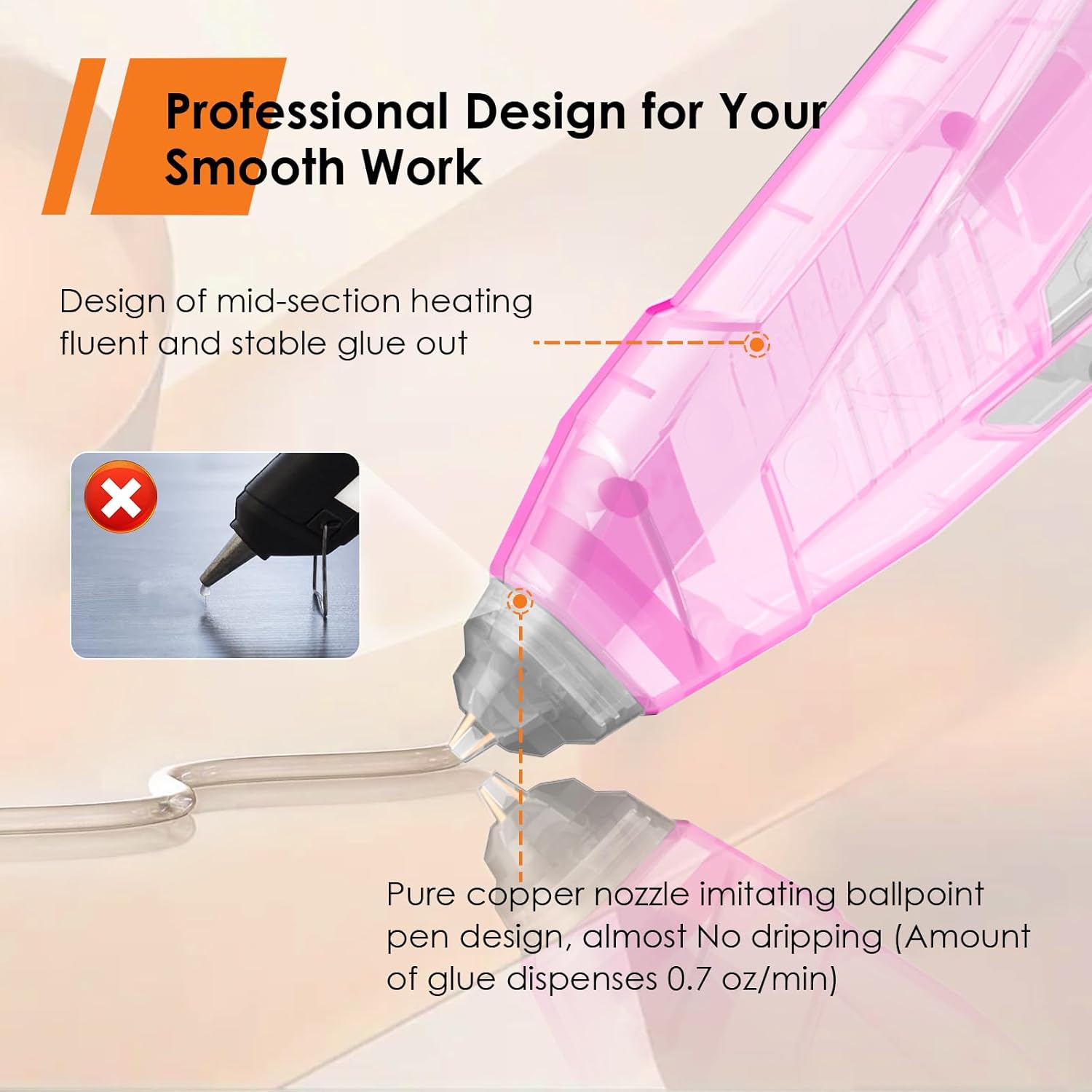 - Anti-drip Design - Refuse to leak glue! The copper and insulating nozzles are designed to prevent glue leaks and save more glue sticks. The pink drip-proof PVC table mat in the set keeps your workshop clean all the time.