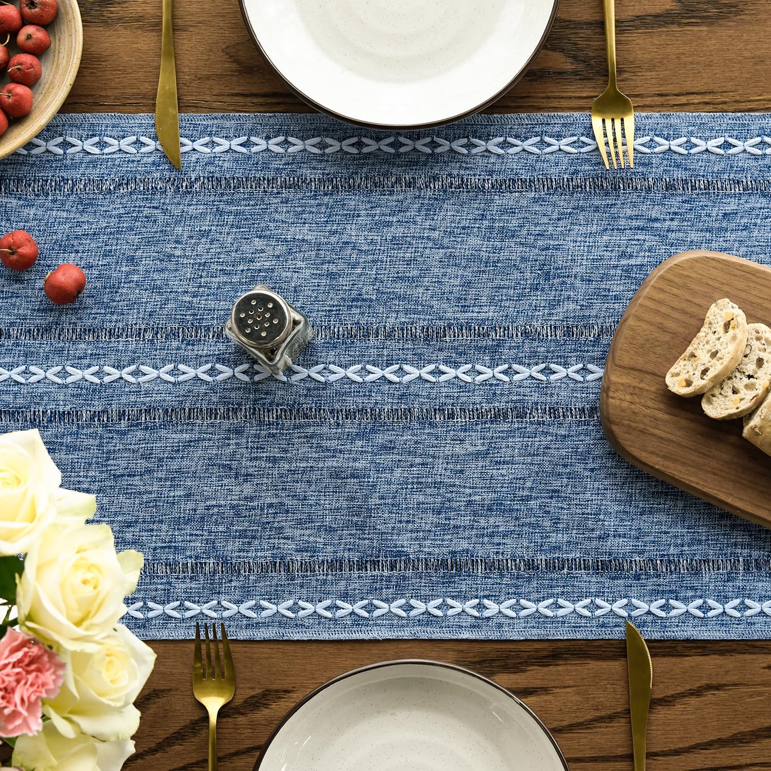 Artoid Mode Blue Rustic Cotton Linen Table Runner, Seasonal Embroidered Hollow Kitchen Dining Table Decoration for Home Party Decor 13x108 Inch