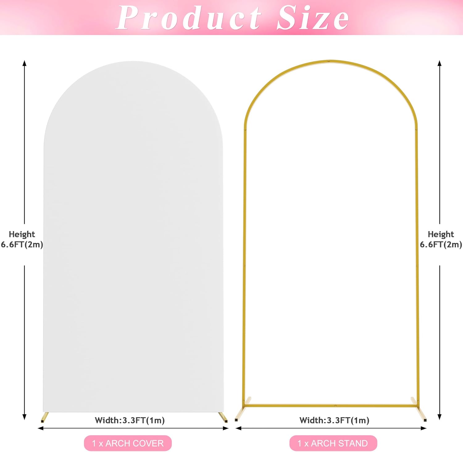 - 【Arch Backdrop Stand and Covers Package】Package contains 1pcs wedding arch stand and 1pcs arch cover. Size: 6.6x3.3ft(HxW). Material: metal arch backdrop stand and spandex arch cover. Color: White arch cover and gold wedding arch stand. Decorate your party with our gold arch stand and arch covers to create an epic decor for your celebration.