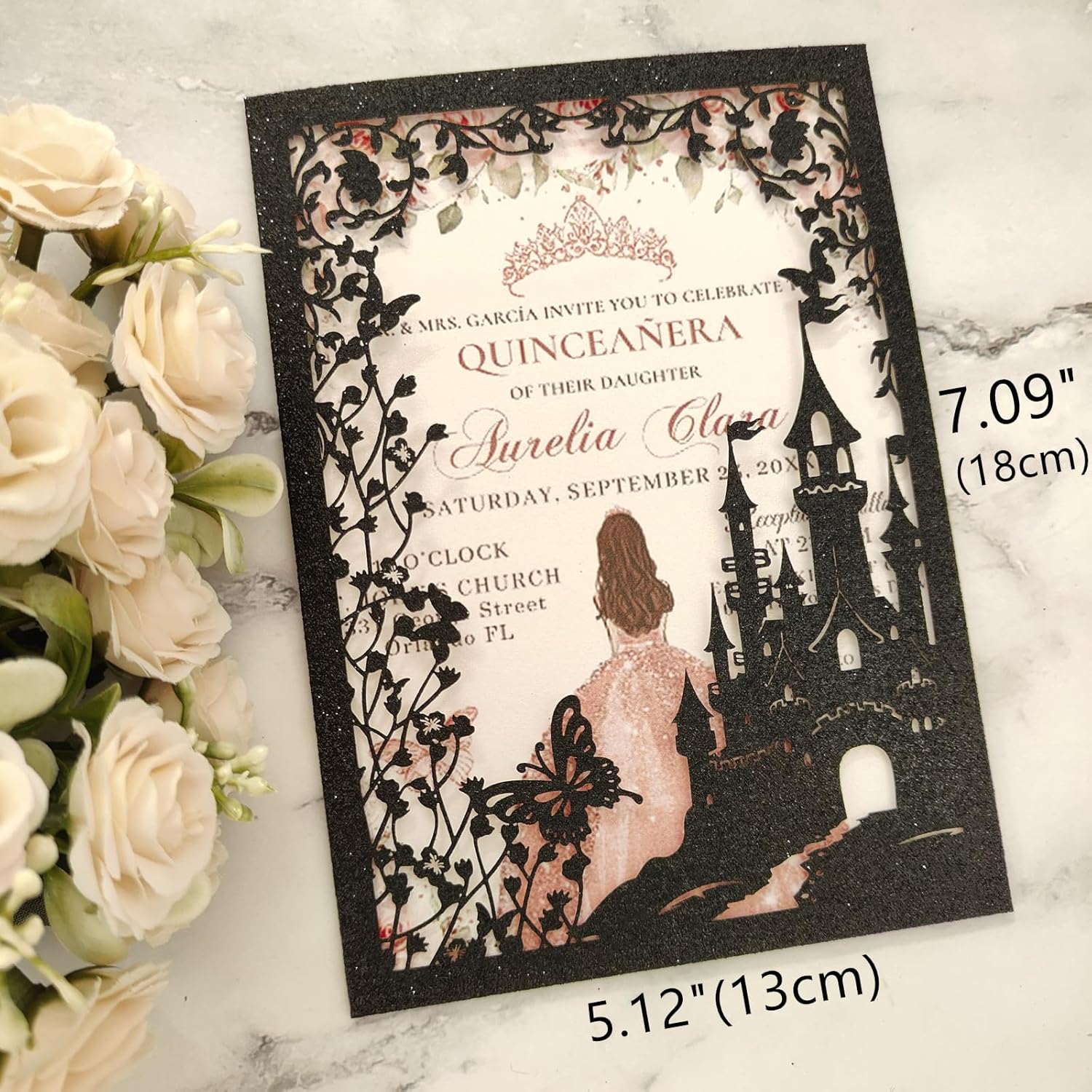 20PCS Castle Pocket Invitations, Quinceanera Invitations with Envelopes, Princess Invitation, Laser Cut quince invites (glitter black)