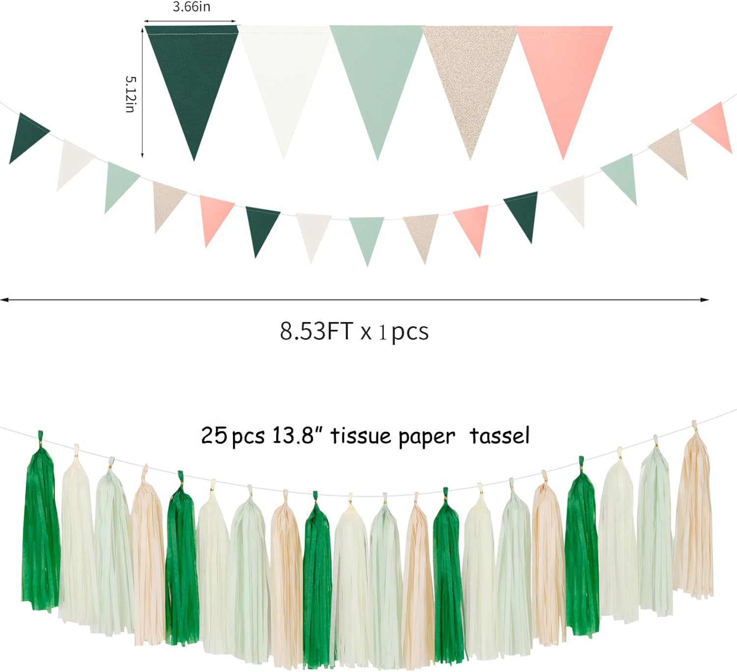 - 【Package Contains】The olive sage green beige champagne gold ivory party kits include 6pcs tissue paper flowers: 3pcs 8" and 3pcs 10" in three color, 1pcs Triangle Flags,1pcs circle dots paper garland,15pcs tassel garland. Total 23pcs.