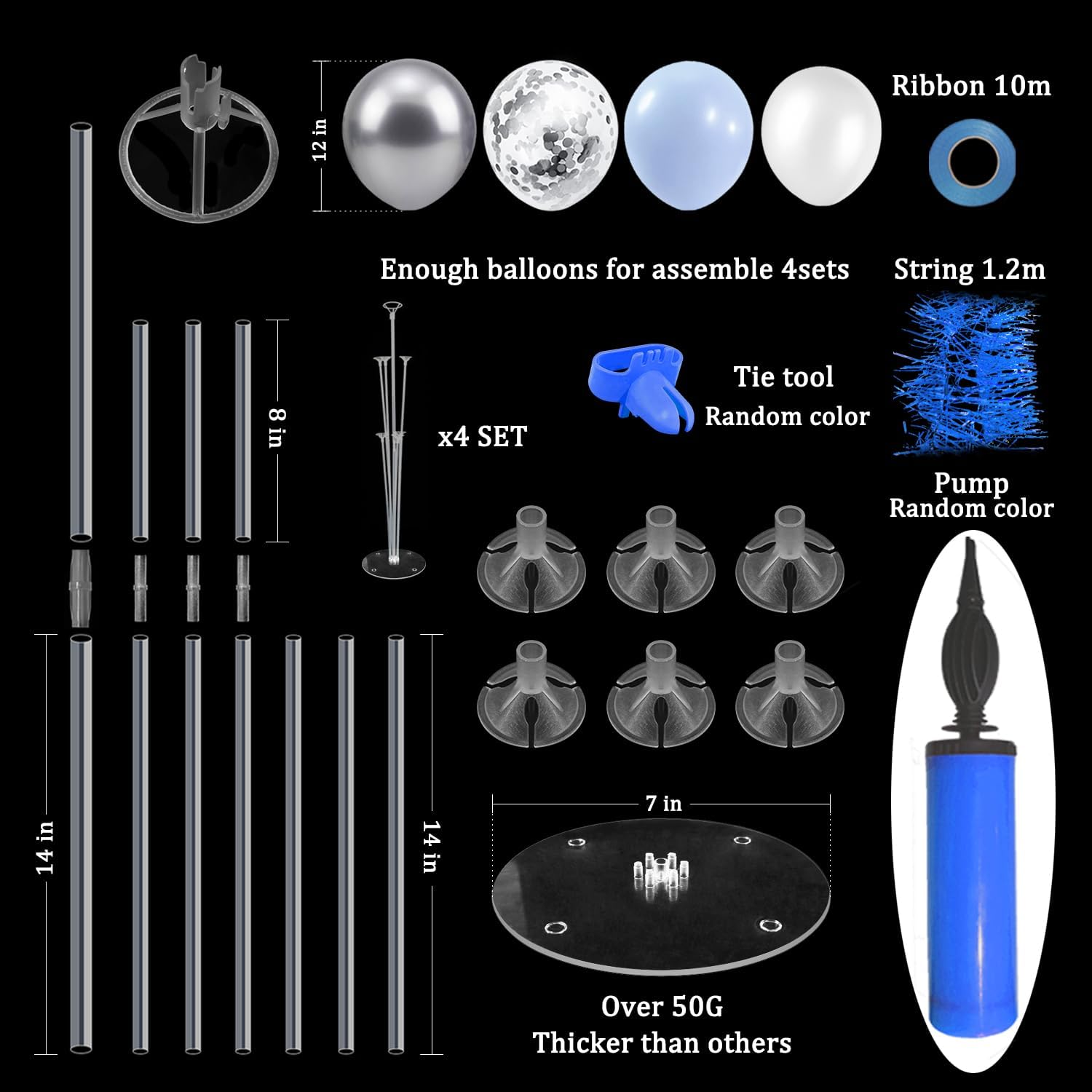 - WHAT INLCUDE: This balloon stand kit include 4 set balloon holders, 35pcs balloons - light blue and white balloons, silver and silver confetti balloons, balloon pump, ribbons, glue dots and tie tool