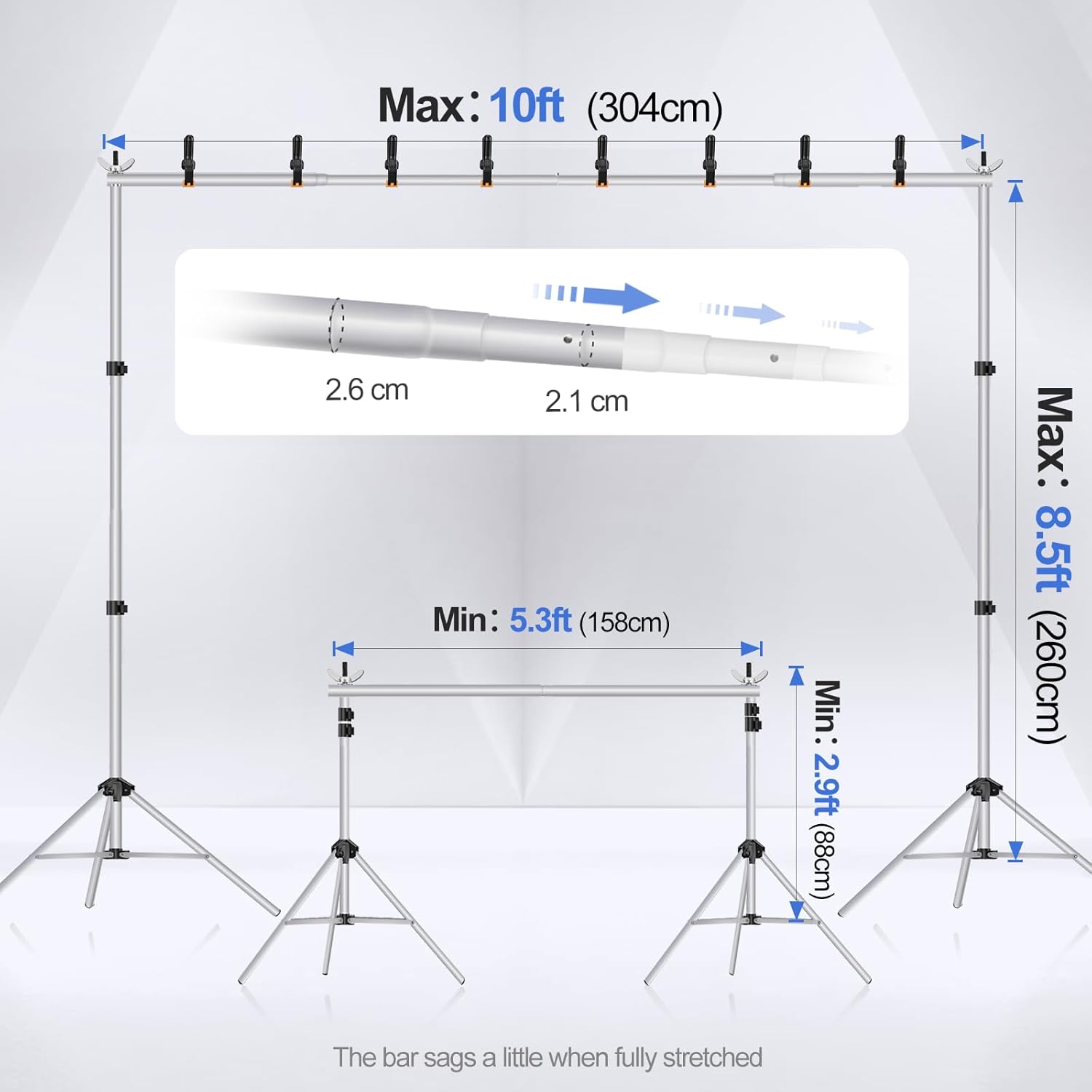 - 【Sturdy Tripod Backdrop Stand】 With adjustable height (2.9ft/0.88m–8.5ft/2.6m) , the aluminum alloy backdrop stand is durable, and the design of the tripod base ensures it won’t shake when fully extended to its maximum size.
