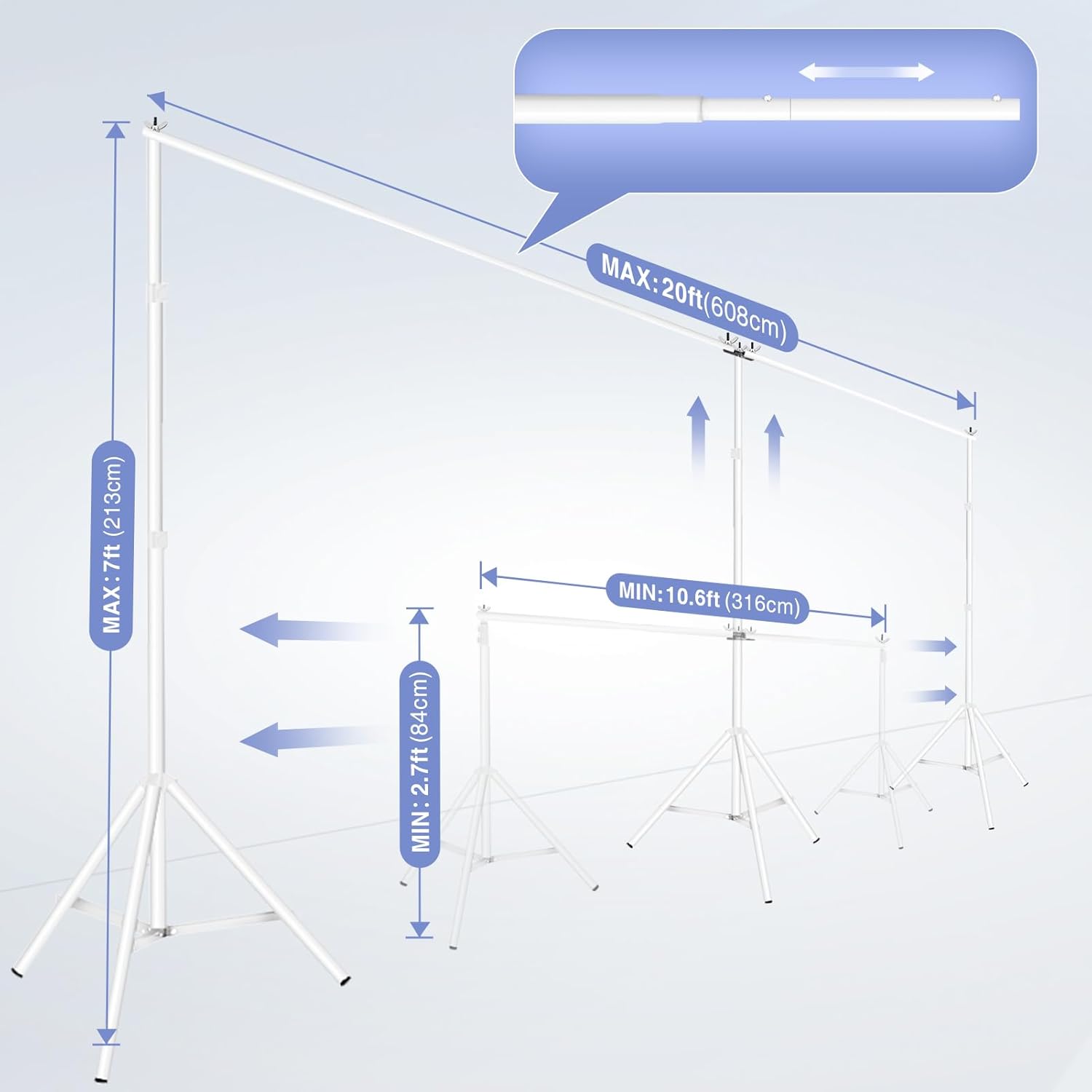- 【Sturdy Tripod Backdrop Stand】 With adjustable height (2.6ft/0.8m–7.0ft/2.1m) , the aluminum alloy backdrop stand is durable, and the design of the tripod base ensures it won’t shake when fully extended to its maximum size.