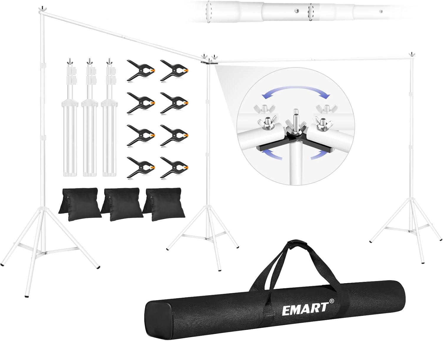 EMART Backdrop Stand, 20x7ft(WxH) Large Adjustable Background Support System with 308° Angle Rotatable Connector, 8 Clamps, 3 Sandbags and Carry Bag for Paties, Wedding, Photography Studio -White