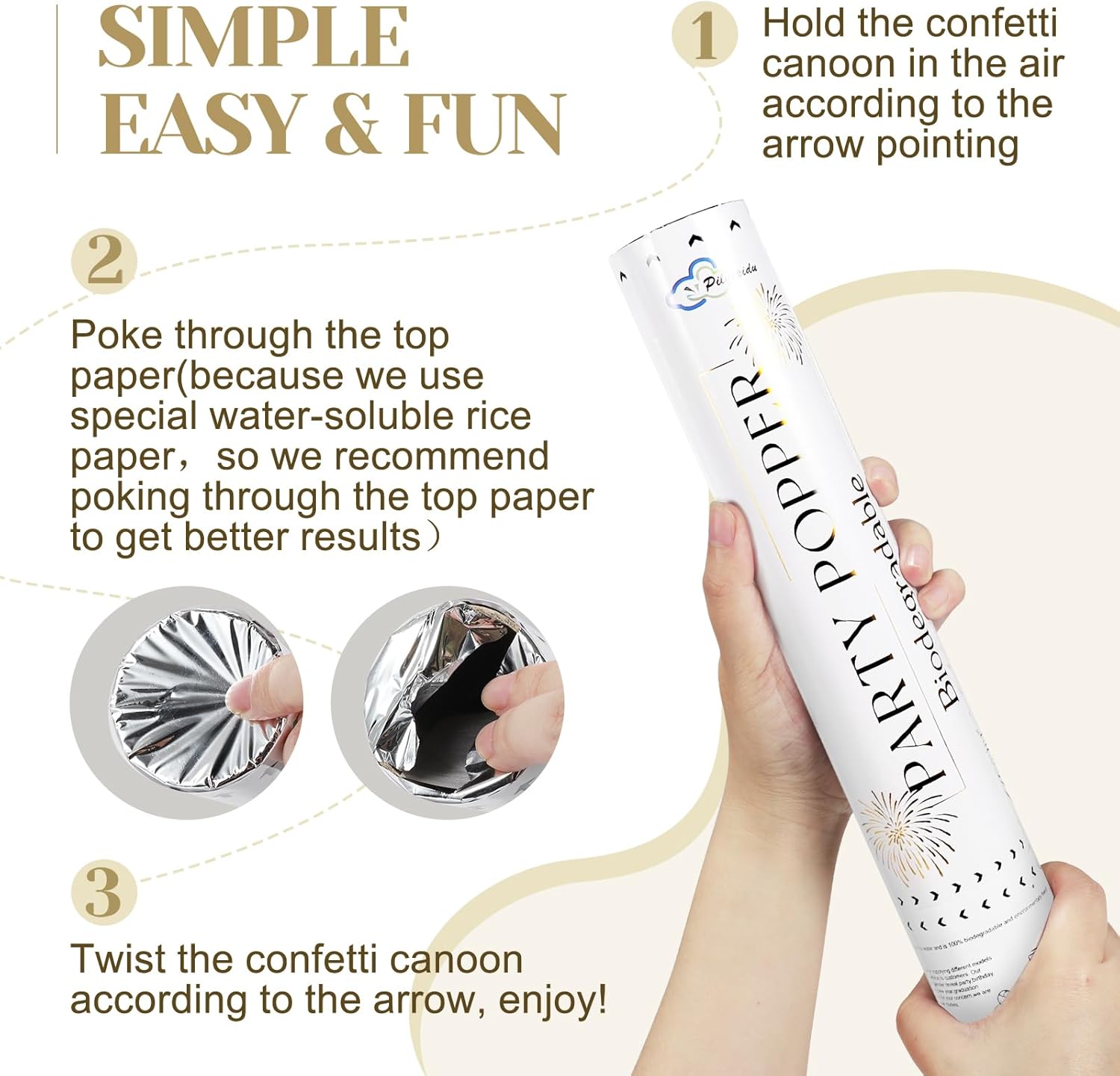 - How To Use: Hold the confetti according to the direction of the arrow on top of the confetti, then twist it slightly along the direction of the arrow, with a pop sound that makes everyone excited, the confetti falls in the sky, very beautiful and impressive. Don't forget to take a photo to record the moment