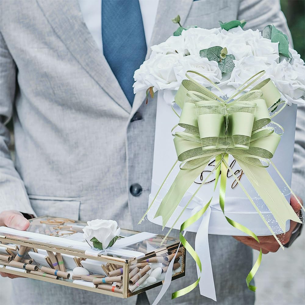 - Package: Each pack contains 15 gift bows, and their assembled diameter is 6 inches. Our Sage green bows for present are made of organza and high-quality material, and they look elegant and glamorous. Use this large bow as the finishing touch to your gift wrapping and make your gift truly stand out!