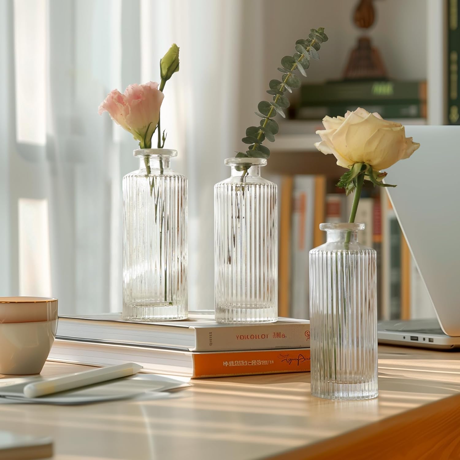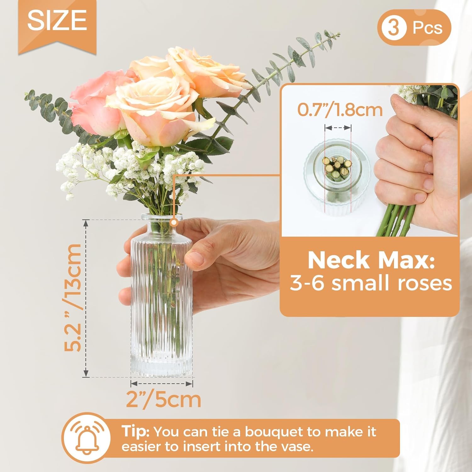 ComSaf Glass Bud Vases Set of 3, Small Flower Vases in Bulk, Mini Ribbed Vases for Centerpieces, Clear Vintage Vase for Table Decorations, Wedding, Party, Receptions, Home Decor (Different Sizes)