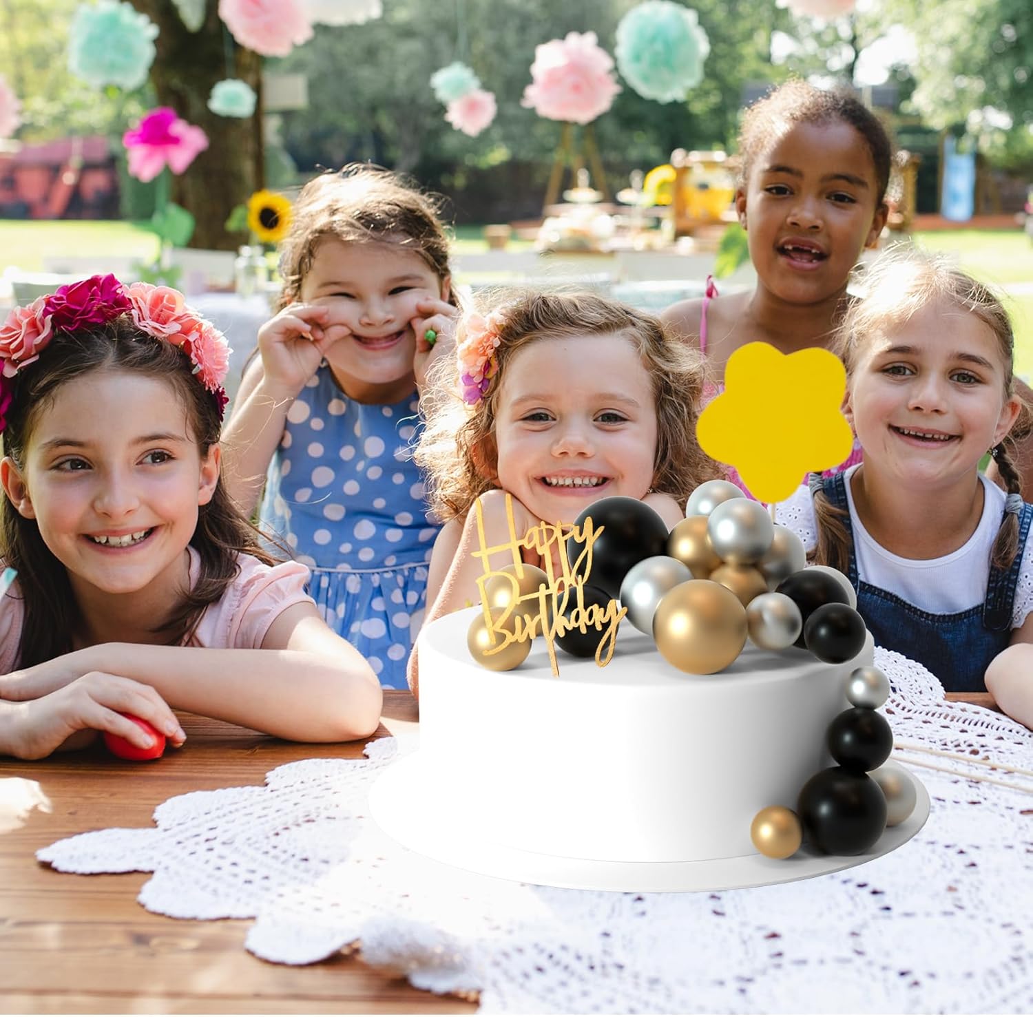 - Package included : 10pcs white grass cake toppers, 1pc happy birthday cake topper, 14pcs black balls, 14pcs gold balls, 14pcs sliver balls