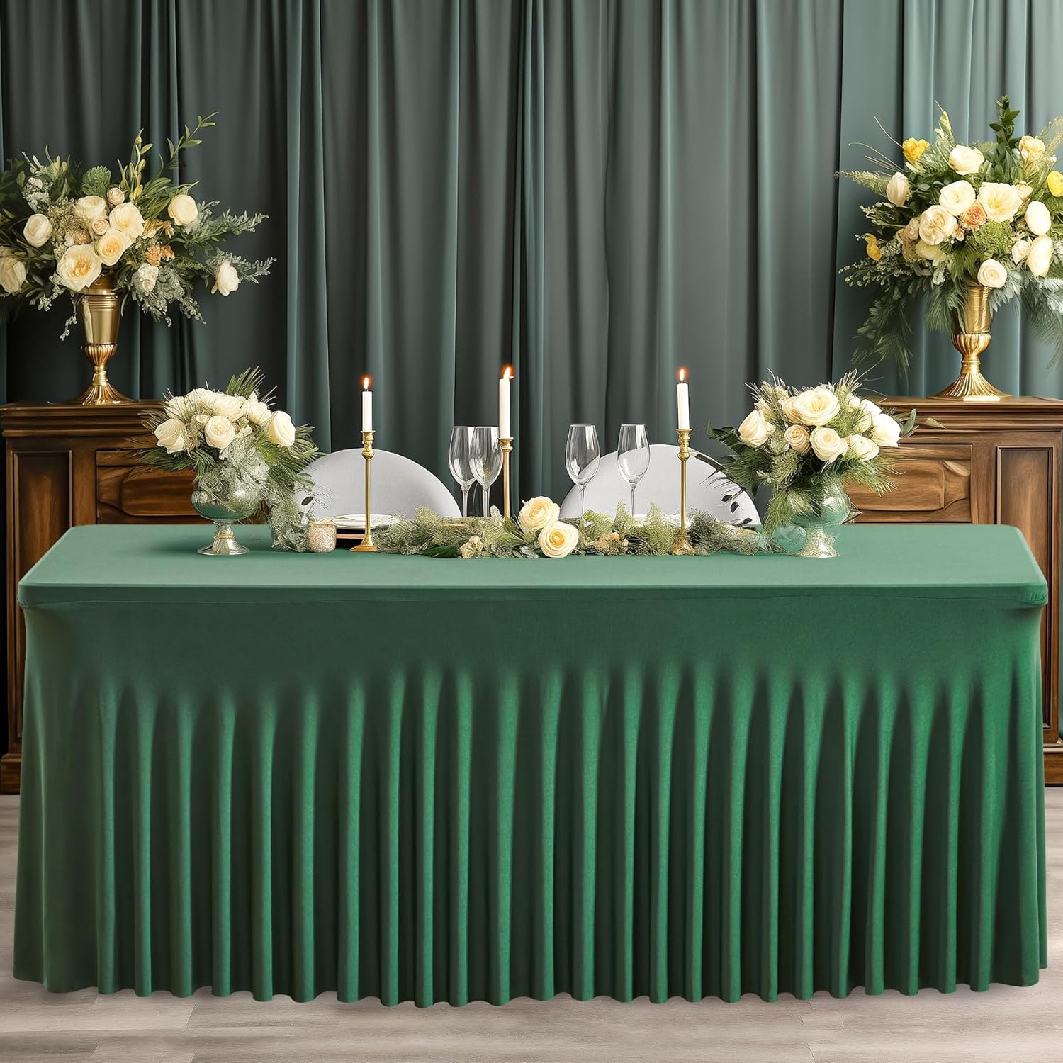 Wish Care 6 Pack Hunter Green Stretch Spandex Table Clothes for 8 Foot Rectangle Tables, 8FT Wrinkle Free Fitted Tablecloths Ruffles Design Table Cover for Party, Banquet, Wedding and Events