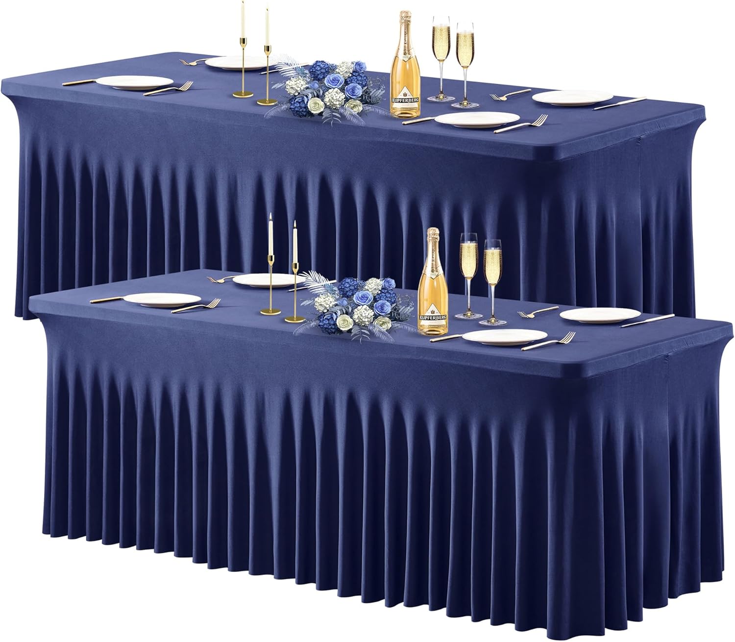 Wish Care 2 Pack Navy Blue Spandex Table Clothes for 8 Foot Rectangle Tables, 8FT Wrinkle Free Fitted Tablecloths Ruffles Design Table Cover for Party, Banquet, Wedding and Events