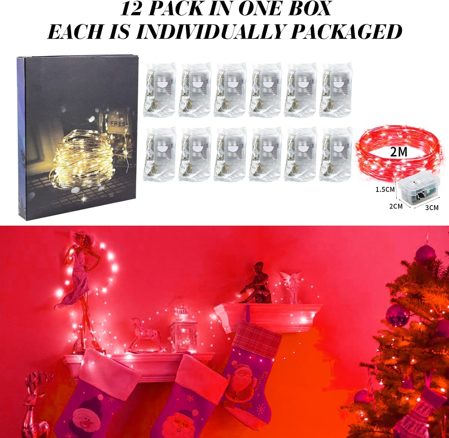 - PREMIUM QUALITY AND LONG LAST LIFE: 12 pack in a box, each twinkle lights made of high quality durable 7 feet long flexible silver wire, and 20 energy-efficient mini led fairy lights, 4 inch distance between each led moon lights. This fairy lights battery operated by 3 x LR44 batteries (included), which can provide 80 hours life. This Christmas lights is perfect for both everyday decorations as well as holiday decor (Batteries need to be replaced when the string get dims)
