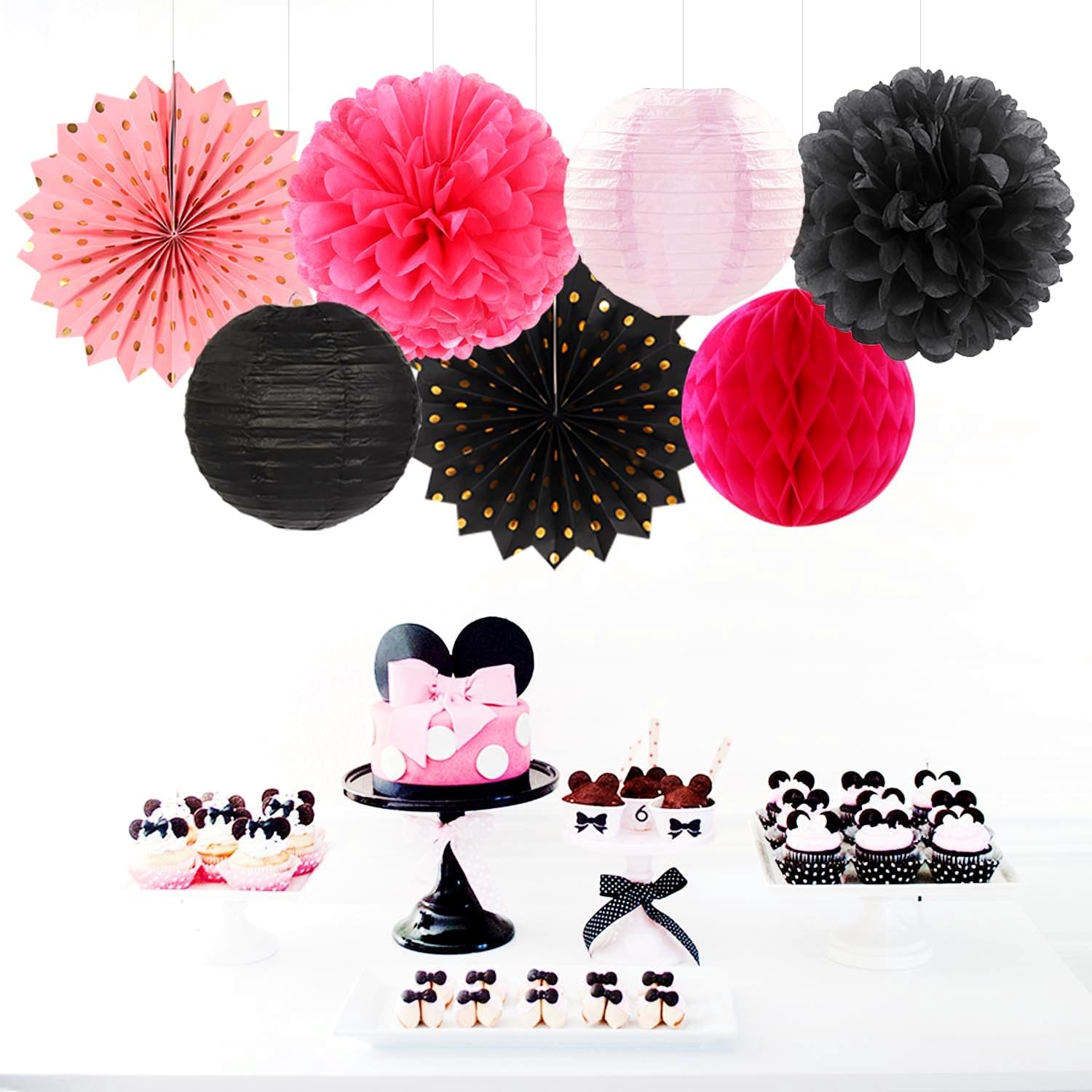 - 【Package Contains】The hot pink black party kits include 6pcs tissue paper flowers: 3pcs 10" and 3pcs 12" in three color, 2pcs 8inch paper honeycom ball,4pcs 8inch paper lantern, 2pcs 12inch paper fan.