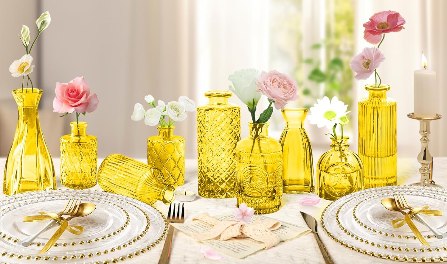 Light Yellow Glass Bud Vases Set, 24 Pcs Vintage Small Vases for Flowers, Crystal Mini Glasses in Bulk, Small Flower Design for Centerpieces Wedding Decorations Home Flower Party Decor