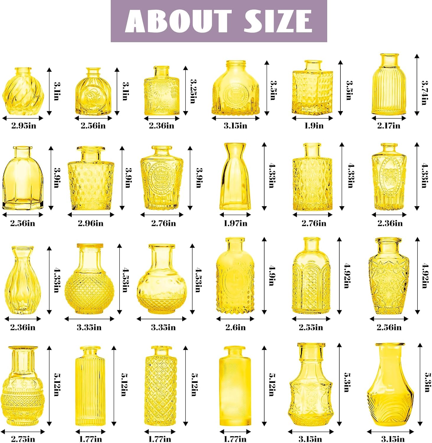 - Different Retro Designs: The set contains 24 small bud vases in bulk with different sizes, shapes and styles. The surface of mini vases bud vases in bulk are all embossed, exquisite, beautiful, unique and textured, and sparkles under the light. Note: Actual colors may vary slightly due to different monitors and lighting.