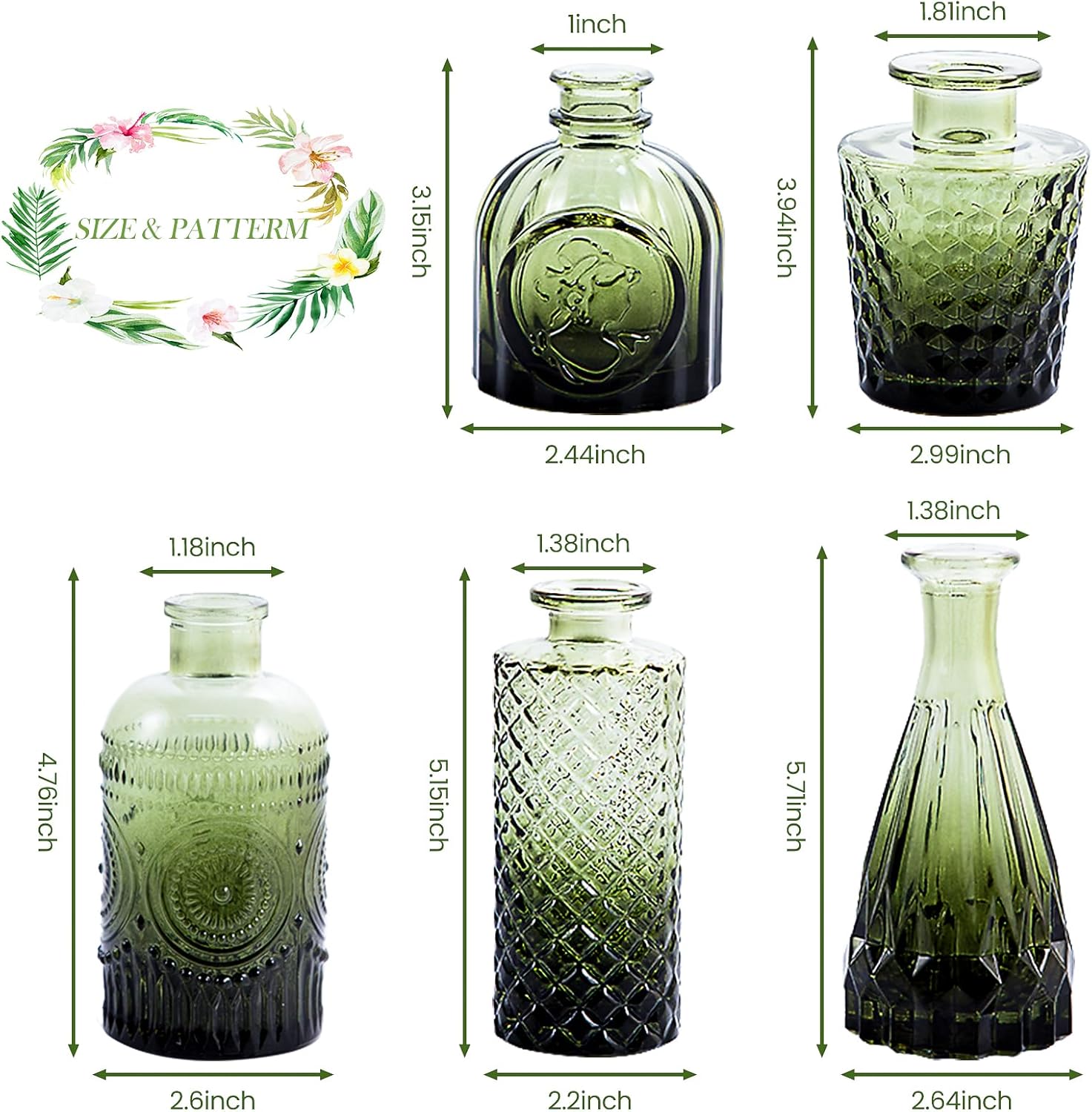 Glass Bud Vases Set of 5, Mini Flower Vase for Centerpieces, Small Clear Vases in Bulk for Wedding Decorations, Vintage Vase for Table, Recepetion, Home Décor (Green)