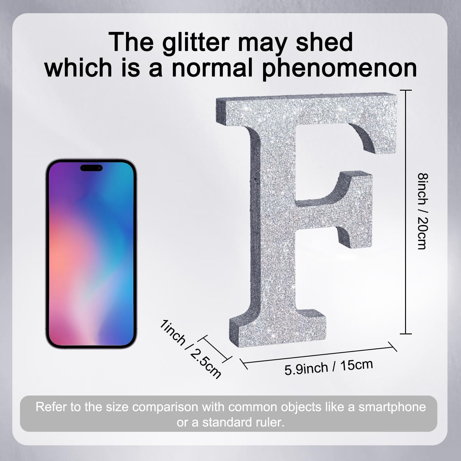 - ITEM INFORMATION AND SIZE: 1 Pcs * F Silver Glitter Letter Ornament. Size: 8 * 5.8 * 1 Inches (20*15*2.5 CM). Before purchasing, Please check the size carefully to make sure it meets your needs