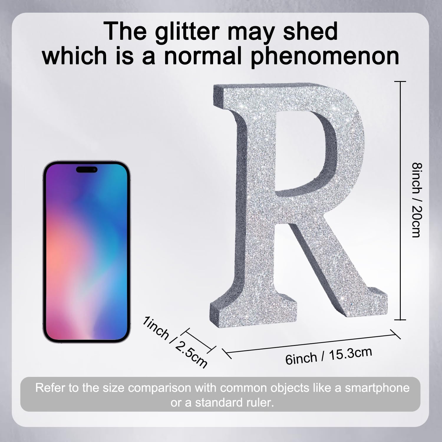 - ITEM INFORMATION AND SIZE: 1 Pcs * R Silver Glitter Letter Ornament. Size: 8 * 5.8 * 1 Inches (20*15*2.5 CM). Before purchasing, Please check the size carefully to make sure it meets your needs