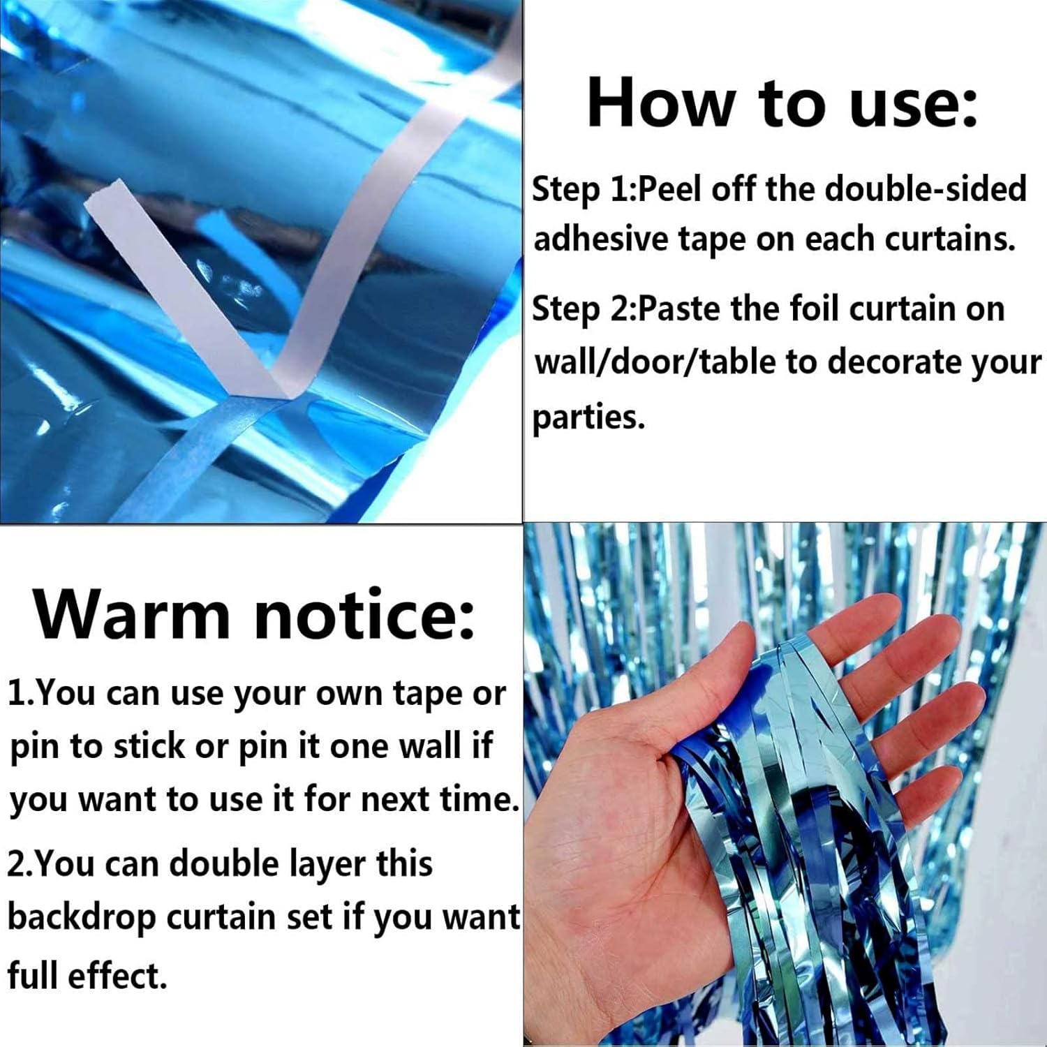 - The foil curtains good for party backdrop curtain, place on a wall and serves as a background for photos of any celebrations like: birthday party, theme party, Halloween, Christmas, New Year Eve, bachelorette party, wedding, bridal shower, baby showers, graduations and more.