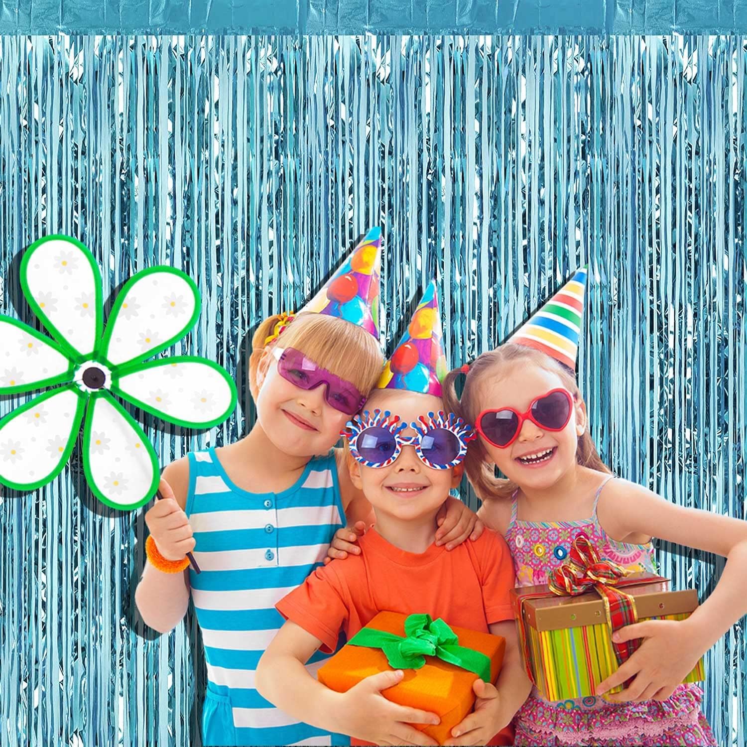 4 Pack Light Blue Foil Fringe Curtain Backdrop, 3.28Ft x 8.2Ft Metallic Tinsel Foil Fringe Streamer Curtains for Photo Booth Props, Birthday, Wedding, Christmas Decoration Party Supplies New
