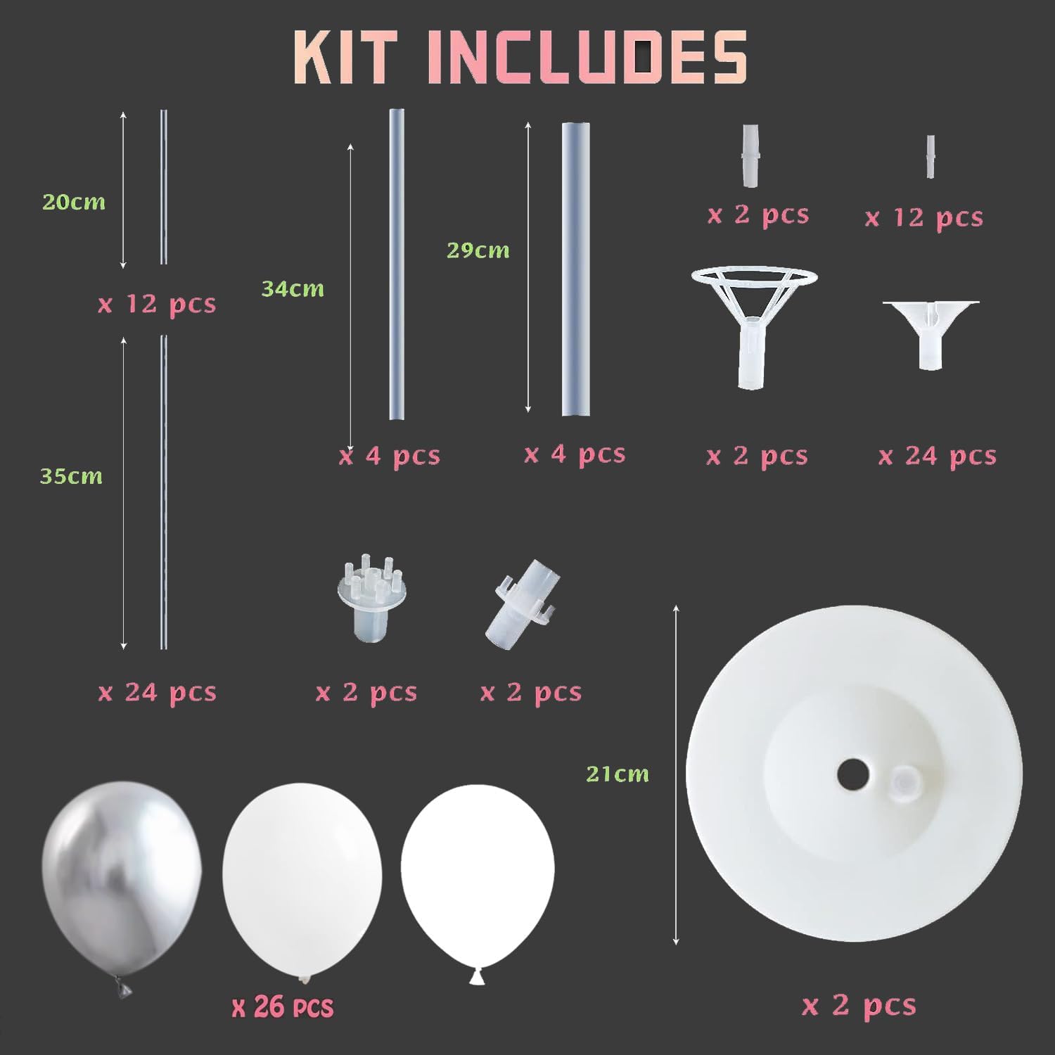 - 【Everything you need in one set!】2 Sets of Balloon Stand Kits, Includes 44 Unconnected Balloon Sticks, 24 Cups, 2 Big Cups, 4 of Which Are Tube Connectors, 12 Mini Union Joints,2 Union Joints,28pcs Balloons,2 Base.Each Balloon Stand Comes in 2 Different Height Sizes.Perfect Size for Table&Ground.