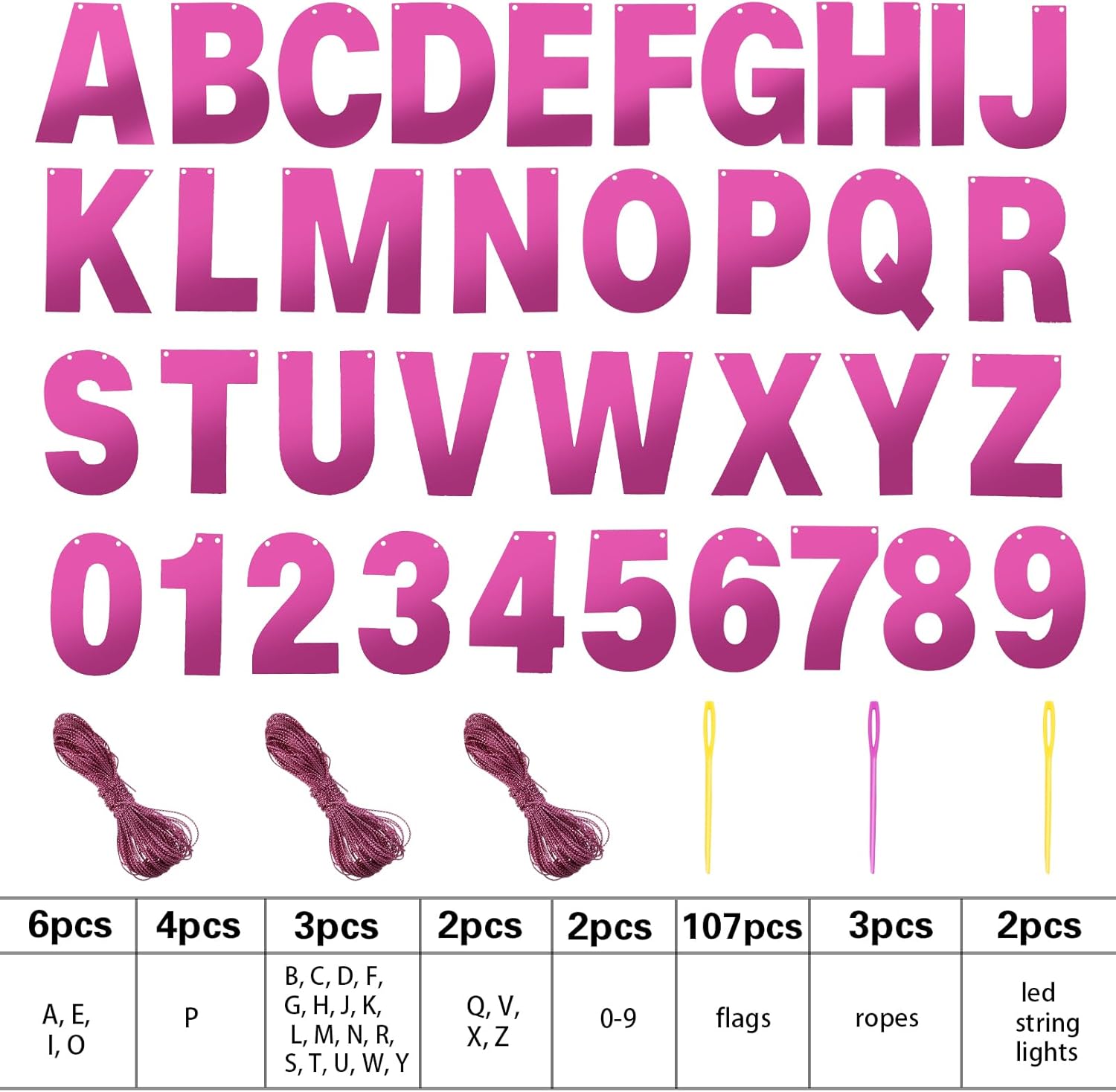 TaoBary 112 Pcs DIY Letter Custom Banner Glitter Customizable Banner Kit Including 107 Letters and Numbers 3 Rope for Valentine Birthday Party(Bright Pink)