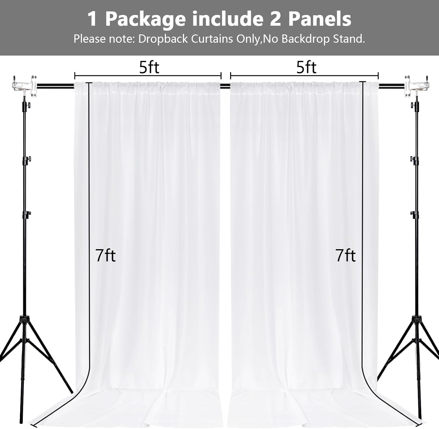 - DIMENSIONS: Each order is for 2 (two) polyester curtains. Each curtain measures 5 feet wide x 7 feet high. Entire backdrop measures 10 feet wide x 7 feet high.Each curtain panel comes with 4 inch rod pocket on top, fit up to any standard rods. (Please note: Dropback Curtains Only,No Backdrop Stand.)
