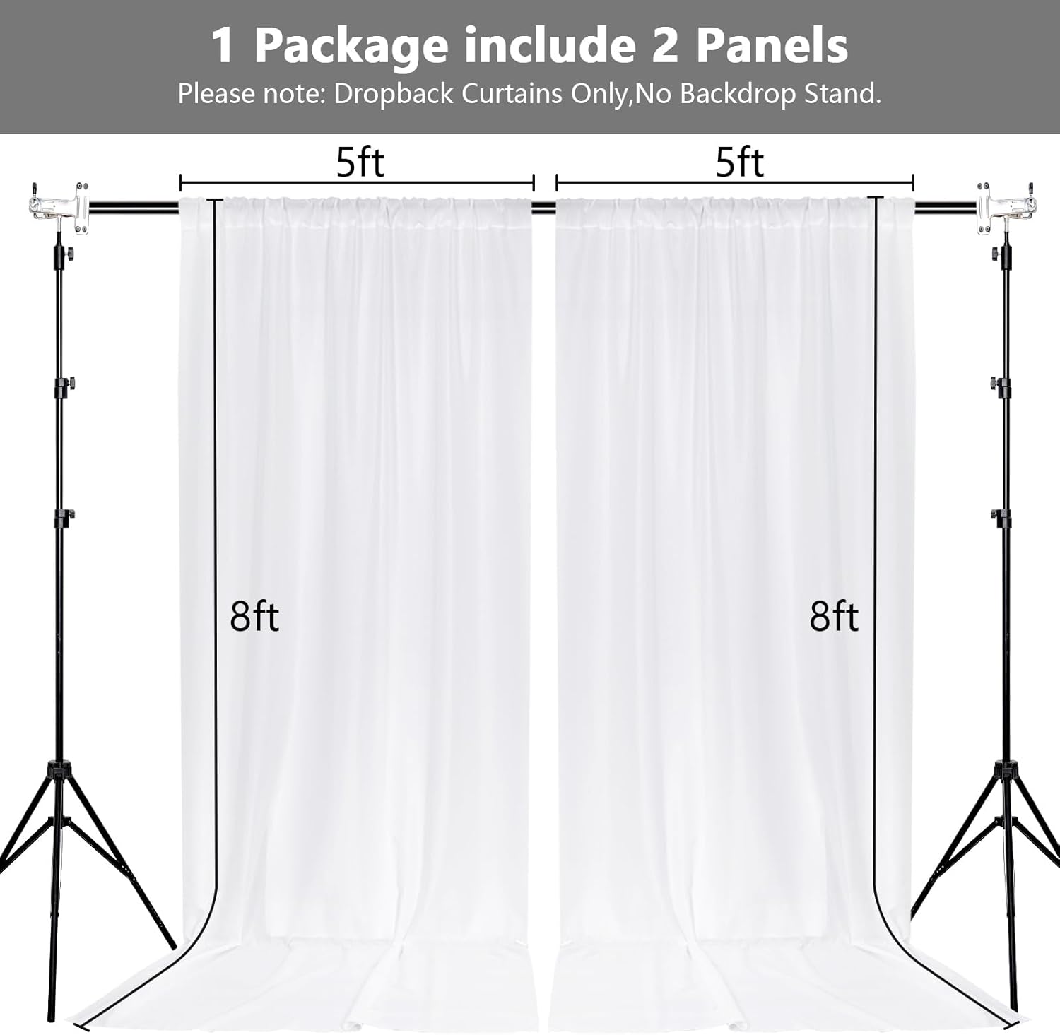 - DIMENSIONS: Each order is for 2 (two) polyester curtains. Each curtain measures 5 feet wide x 8 feet high. Entire backdrop measures 10 feet wide x 8 feet high. Each curtain panel comes with 4 inch rod pocket on top, fit up to any standard rods. (Please note: Dropback Curtains Only,No Backdrop Stand.)